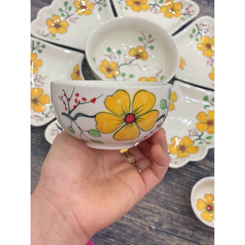Bộ bát đĩa hoa mặt trời vẽ mai vàng gốm thủ công Bát Tràng