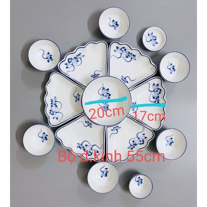 Bộ bát đĩa hoa mặt trời vẽ sen màu đại thanh.Hàng gốn sứ Bát Tràng.