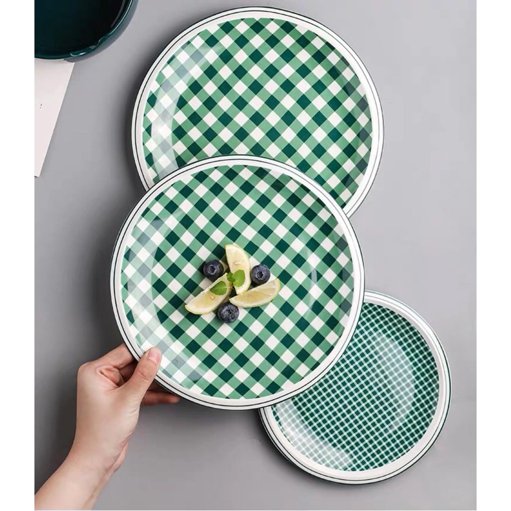 Bộ bát đĩa họa tiết caro xanh phong cách Hàn Quốc trẻ trung, hiện đại, tiện dụng, chất liệu sứ cao cấp