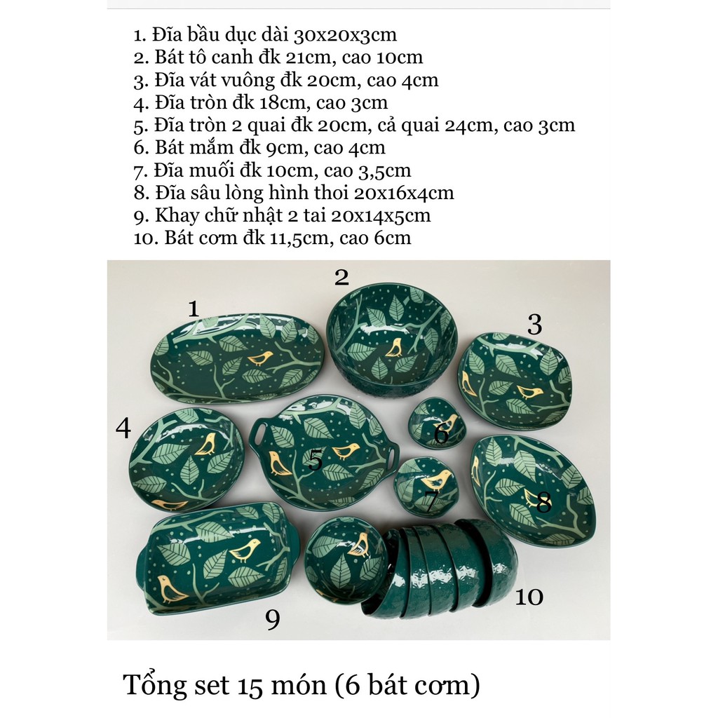 Bộ bát đĩa men xanh gồm 15 món 2 hoạ tiết- Chim và hoa