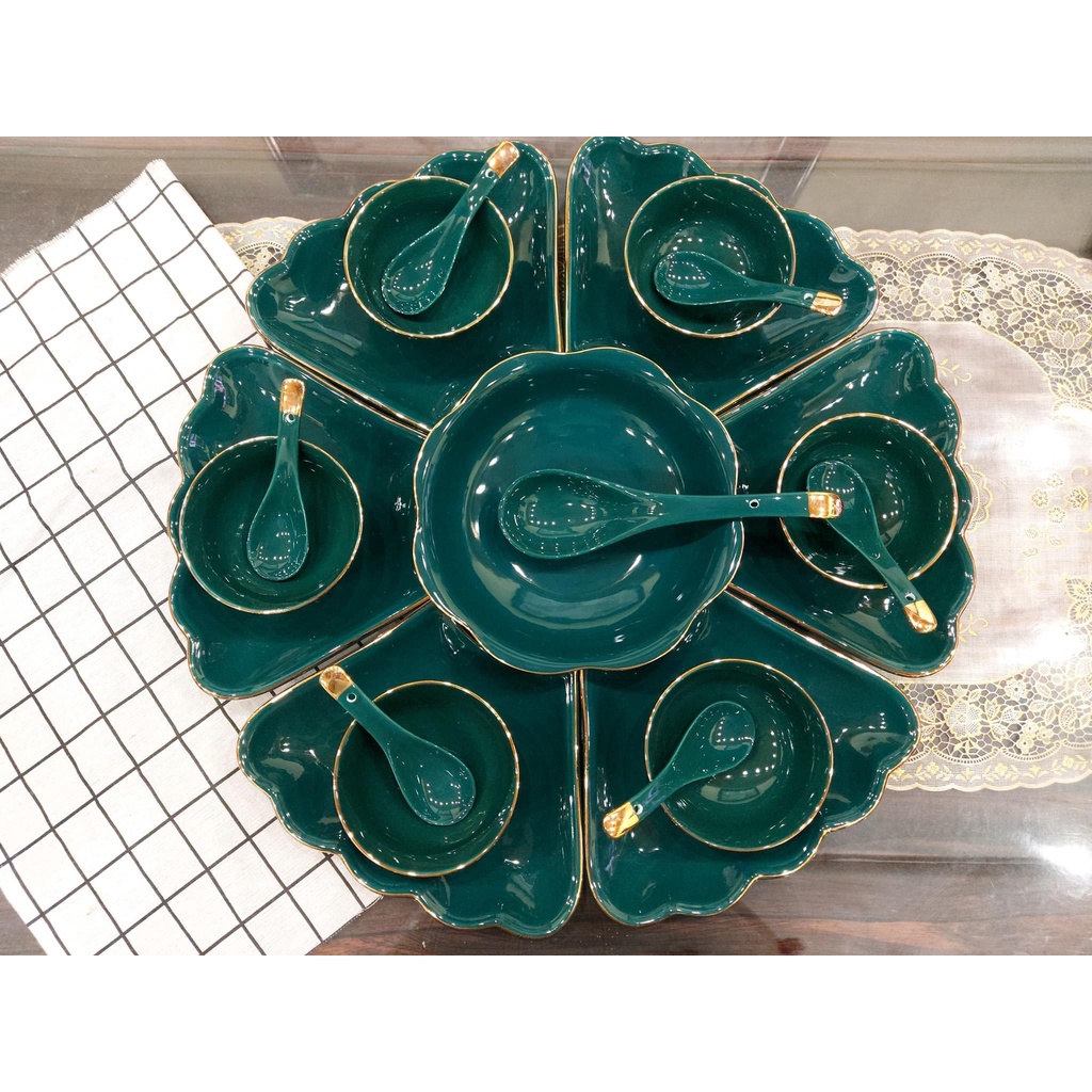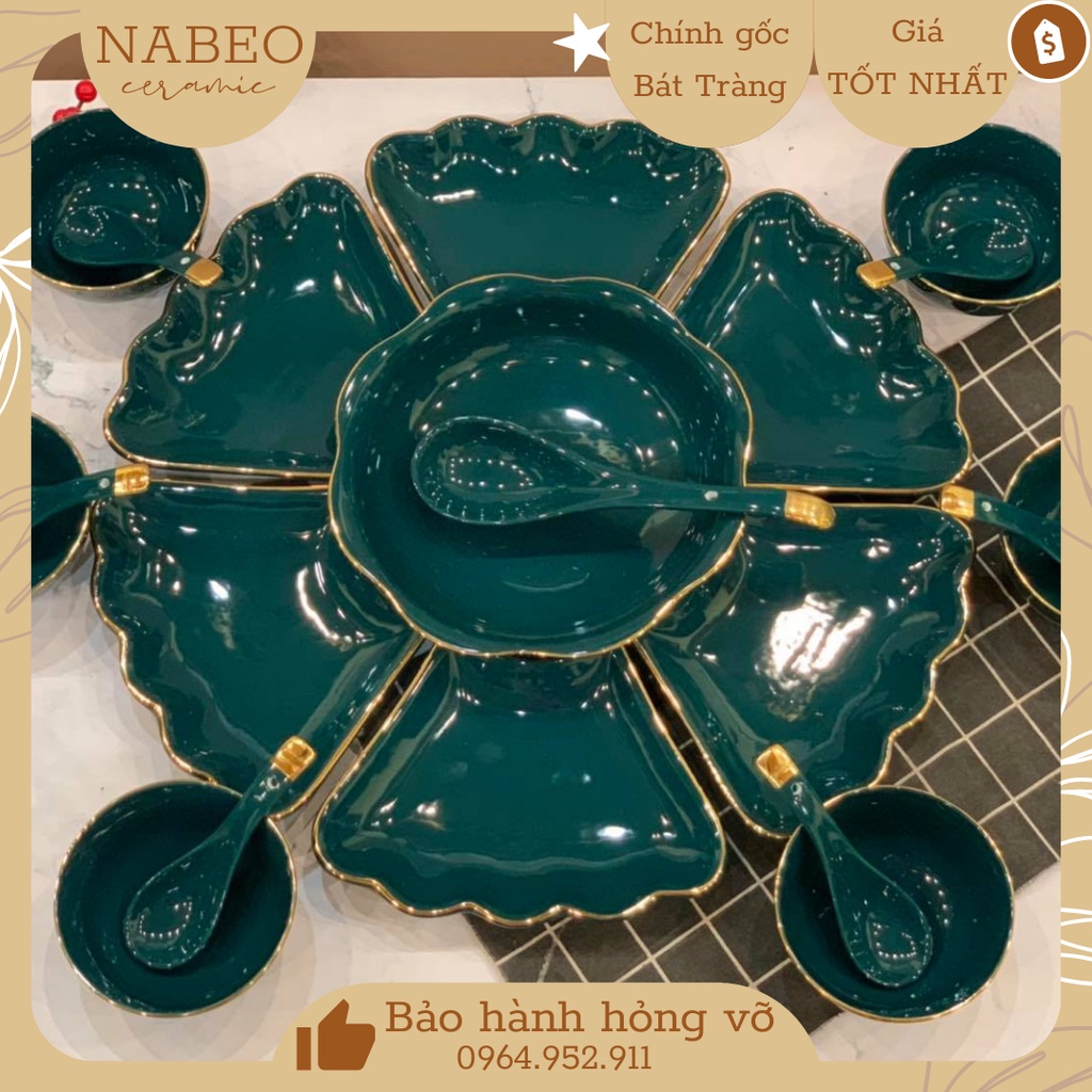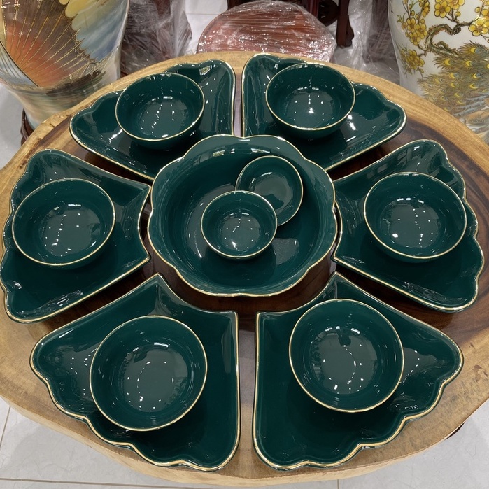 Bộ Bát Đĩa Men Xanh Cổ Vịt Vẽ Vàng Kim Hoa Mặt Trời 6 Cánh - Xanh Lục Bảo - Bộ Bát Đĩa Cúng Gia Tiên - Gốm Sứ Bát Tràng