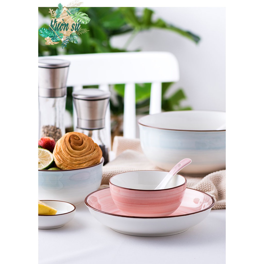 Bộ bát đĩa sứ 15 món vân sóng xanh, hồng cao cấp - VS55