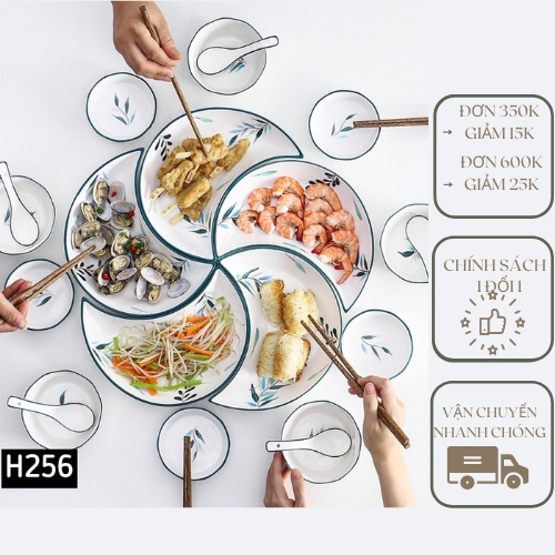 - Sản phẩm gồm: 25 món: 5 đĩa bán nguyệt, 5 bát, 5 đôi đũa, 5 thìa, 5 đĩa gia vị