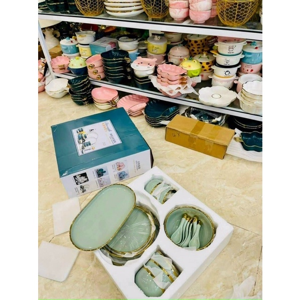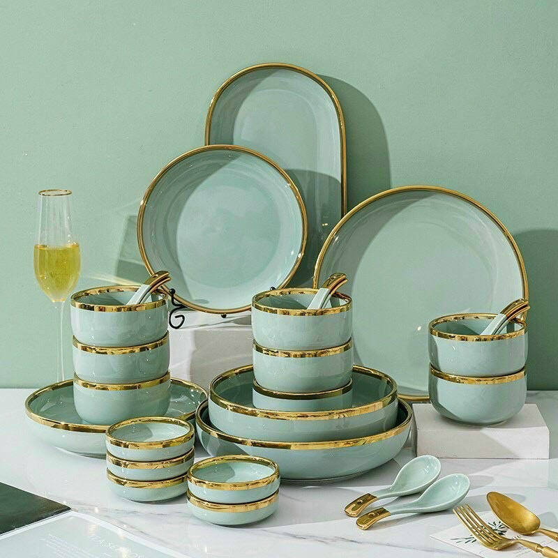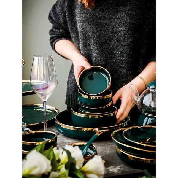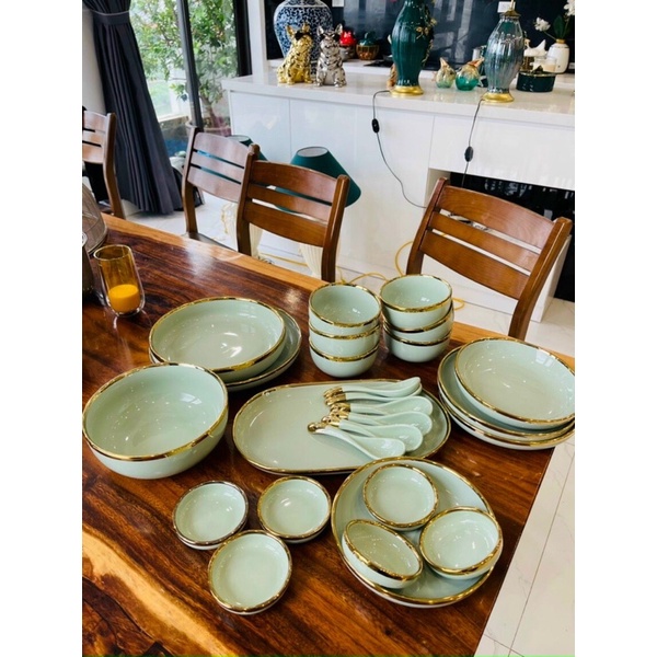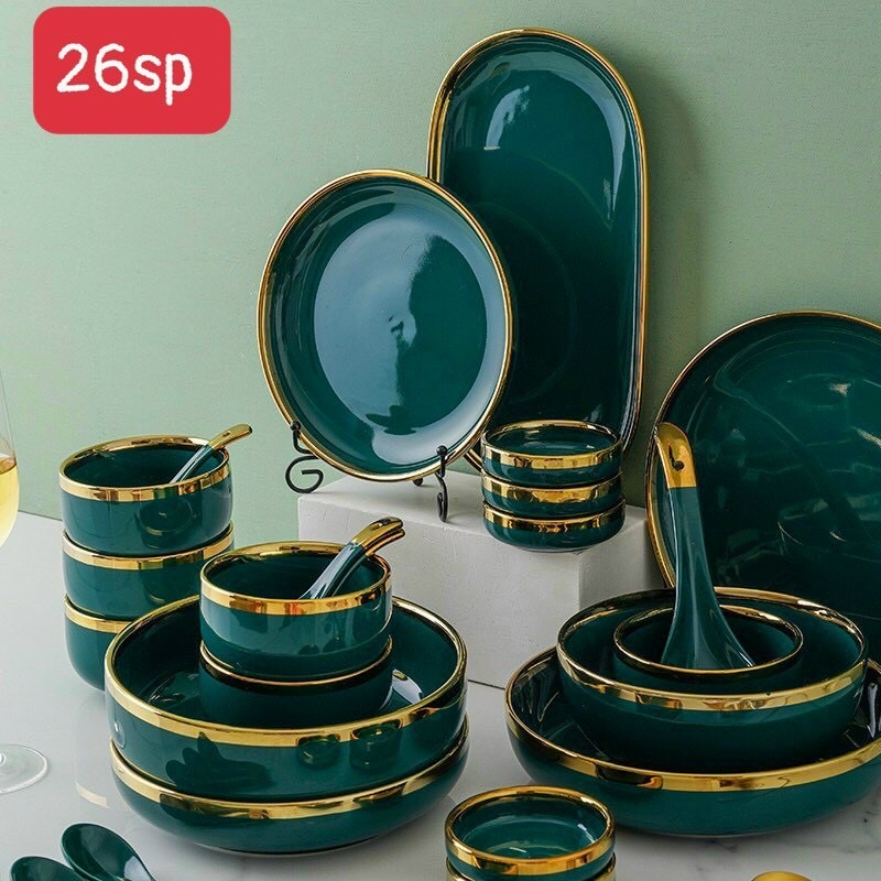 Bộ bát đĩa 26 món viền mạ vàng sang trọng xanh ngọc và xanh lục- Sản phẩm được làm từ chất liệu gốm sứ cao cấp, bền đẹp, được tráng men sáng bóng. Chất liệu không chứa chì, kim loại nặng, không độc hại, tuyệt đối an toàn cho sức khoẻ người sử dụng