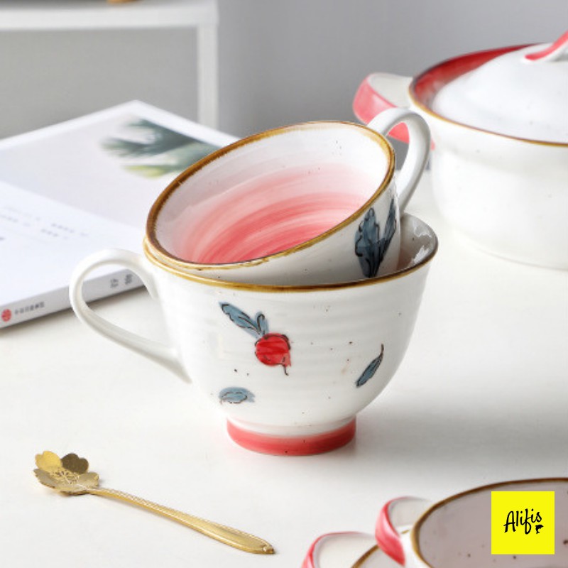 + Bộ sưu tập bát đĩa sứ được thiết kế độc đáo với họa tiết củ cải đỏ vẽ tay siêu yêu ạ.