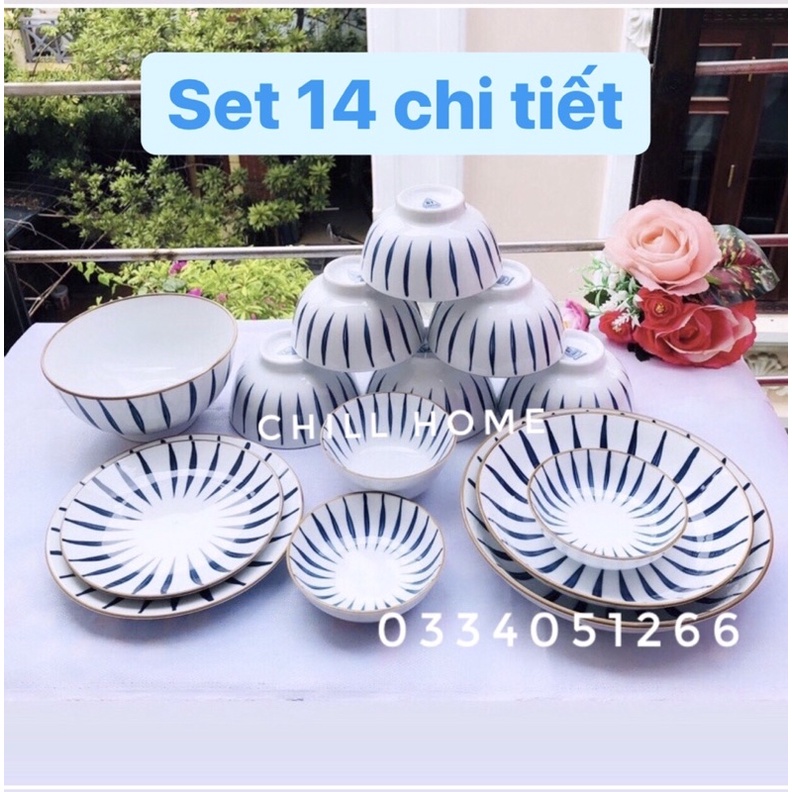 Bộ bát đĩa sứ Bát Tràng 14 chi tiết,men dày dặn sáng bóng,set chén dĩa đẹp,bát decor bàn ăn cao cấp mã B88