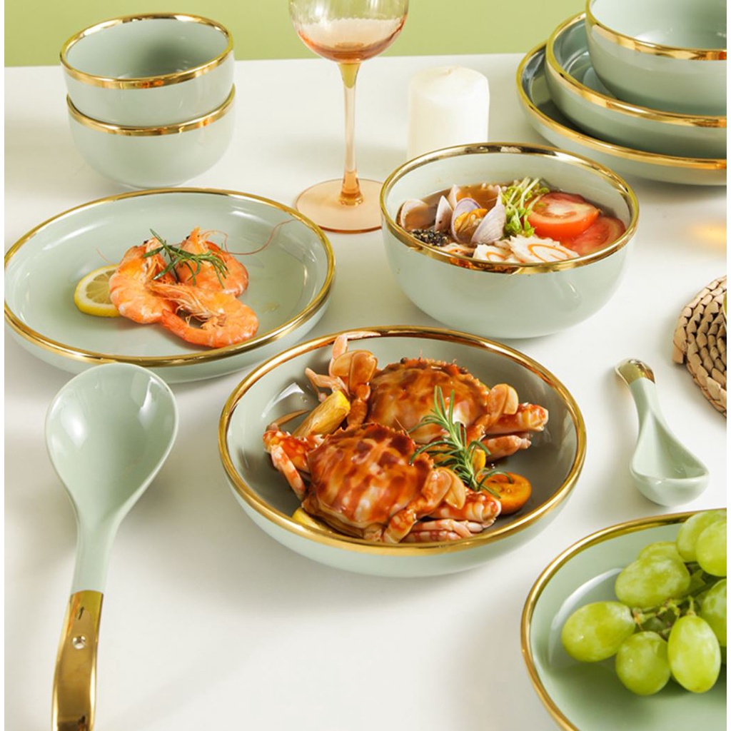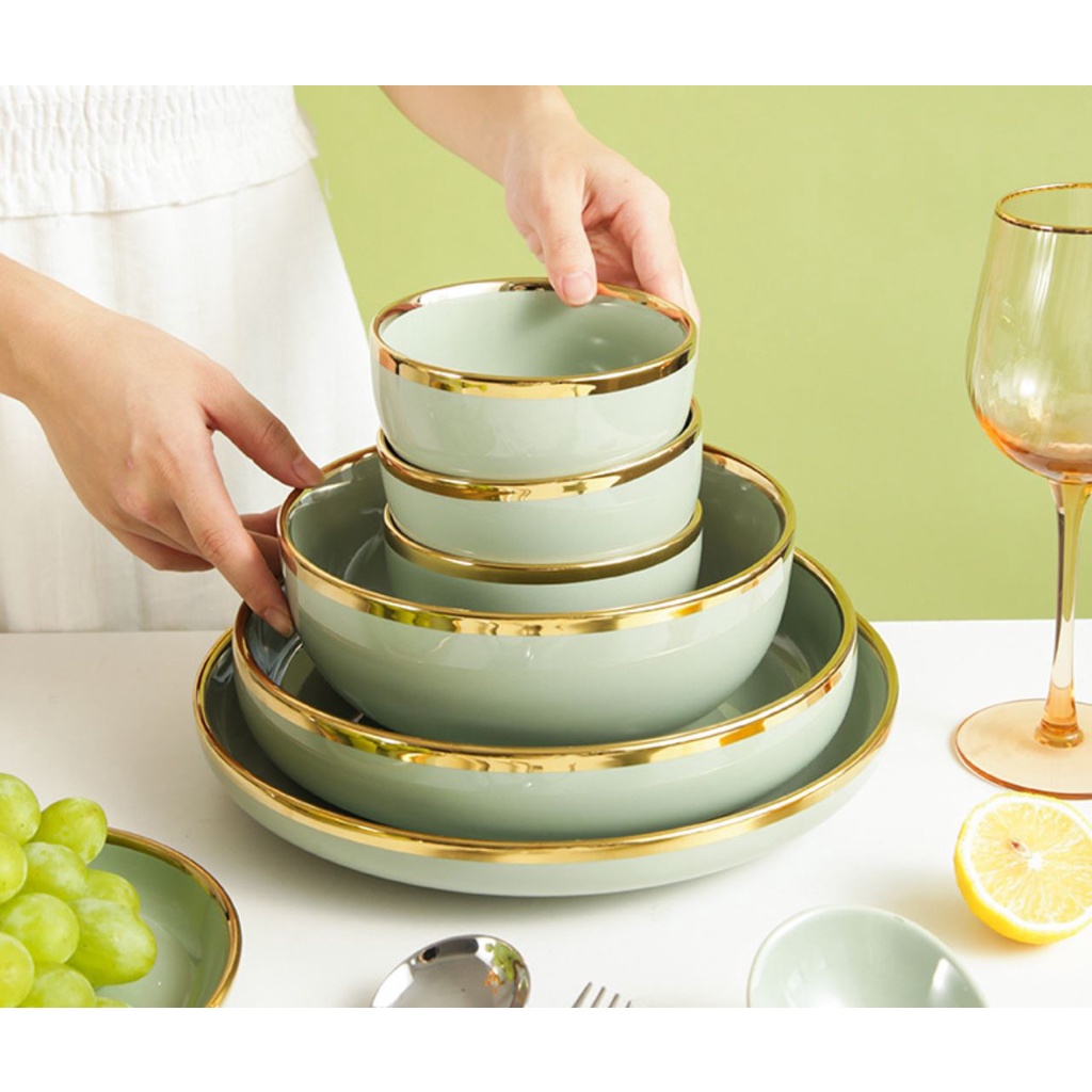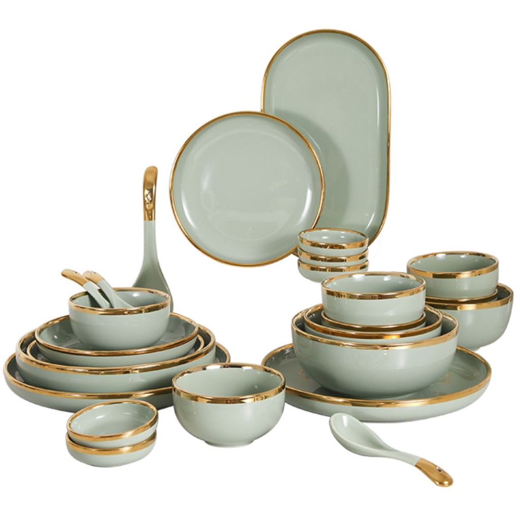 Bát đĩa sứ cao cấp xanh ngọc hot 2021. bộ bát đĩa 26 món xanh ngọc cao cấp. bát đĩa phong cách bắc âu- Sản phẩm: Bộ bát đĩa, bộ bát đĩa sứ 26 món viền vàng cao cấp cho 6 người -