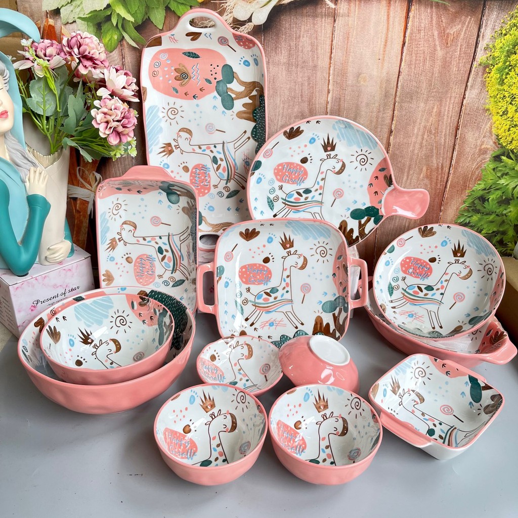 Bát đĩa sứ decor bộ bát đĩa sứ ngựa hồng siêu xinh