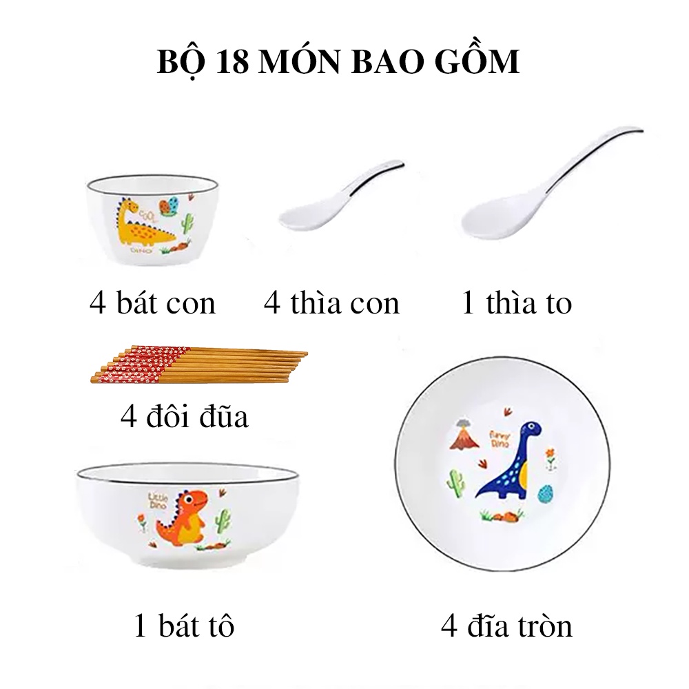 Bộ bát đĩa sứ dùng được lò vi sóng 18 món hình chú khủng long - VS50
