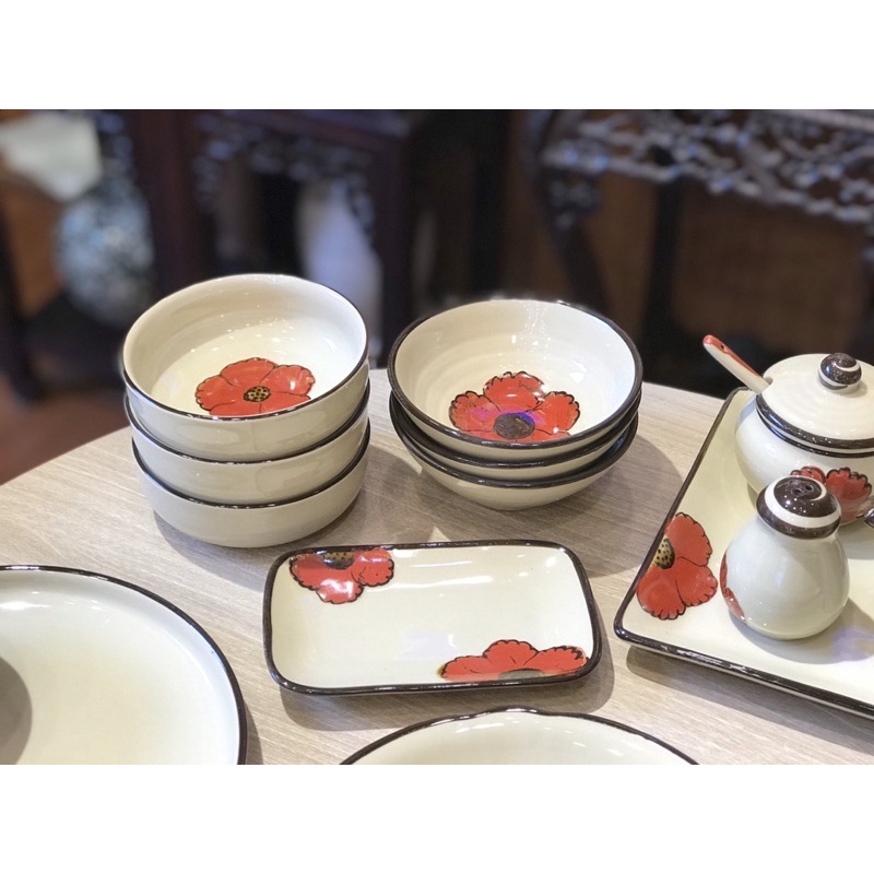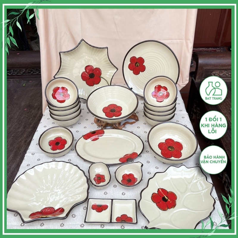 Bộ Bát Đĩa Sứ Hoa Đỏ 3D Hoạ Tiết Vẽ Tay Gốm Sứ Bát Tràng Cao Cấp Chén Sứ Ăn Cơm Tô Canh Đĩa Sứ Tách Lẻ