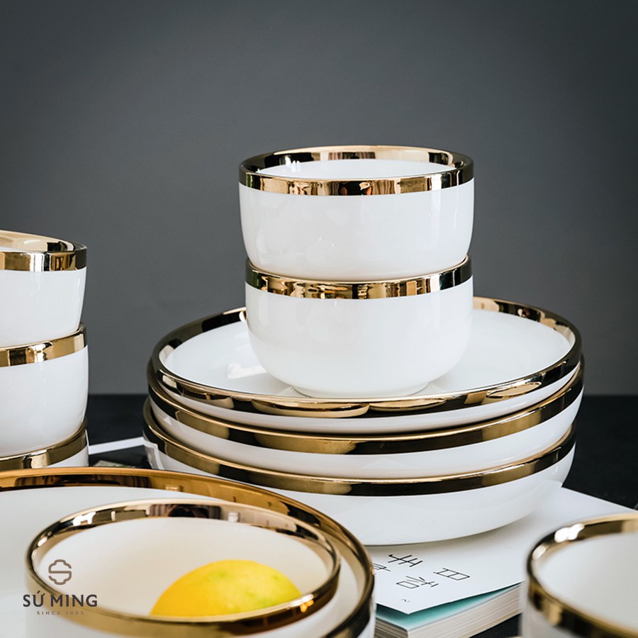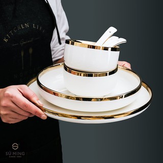Bộ Bát Đĩa Sứ Màu Trắng [BẮC ÂU] [CAO CẤP] sang trọng, viền vàng 24k, tặng 1 bộ đũa hàn quốc , hàng loại 1 sáng bóng