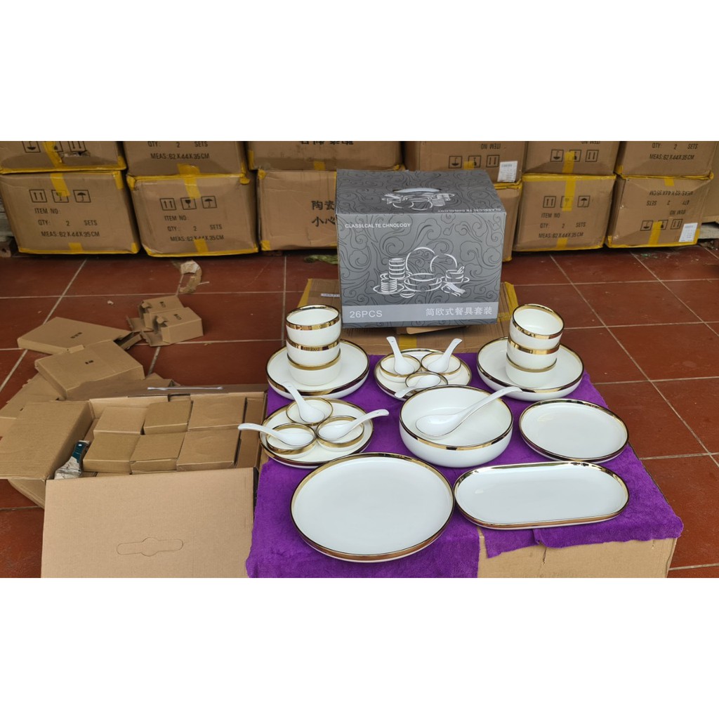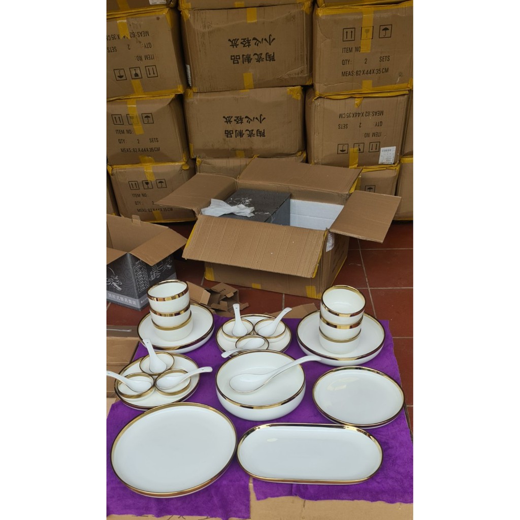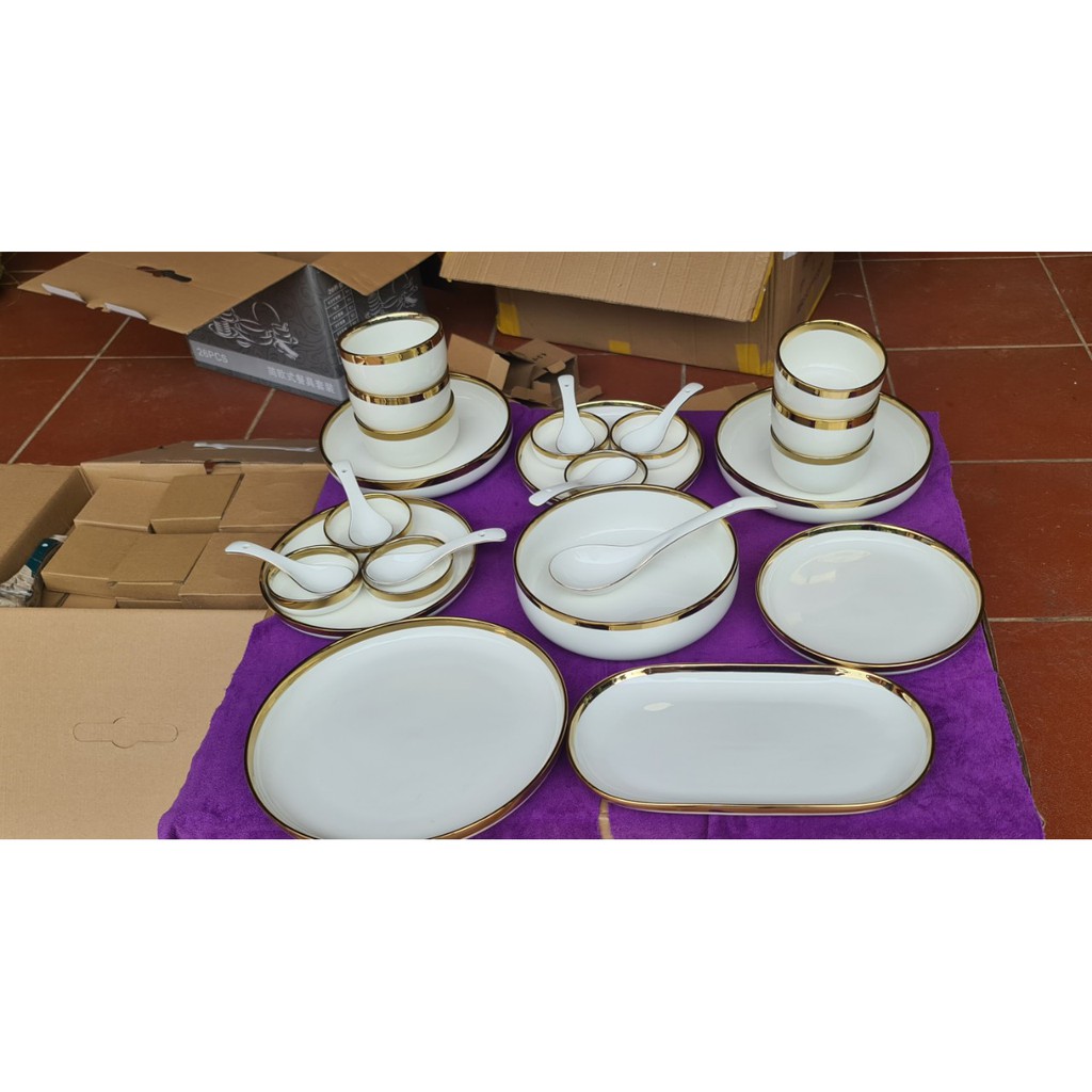 Nhà cửa & Đời sống > Bộ đồ bàn ăn > Dĩa || Bộ Bát Đĩa Sứ Màu Trắng [BẮC ÂU] [CAO CẤP] sang trọng, viền vàng 24k, tặng 1 bộ đũa hàn quốc , hàng loại 1 sáng bóngCòn hàng