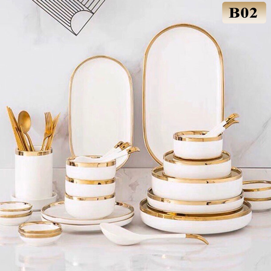 Set bát đĩa đẹp - đồ dùng phòng ăn sứ trắng viền vàng chất lượng caoGIỚI THIỆU: