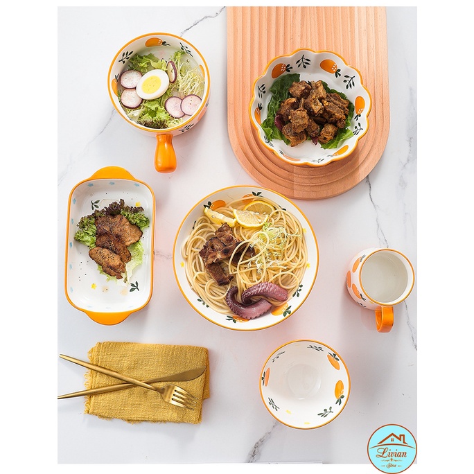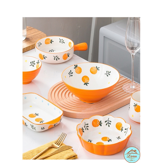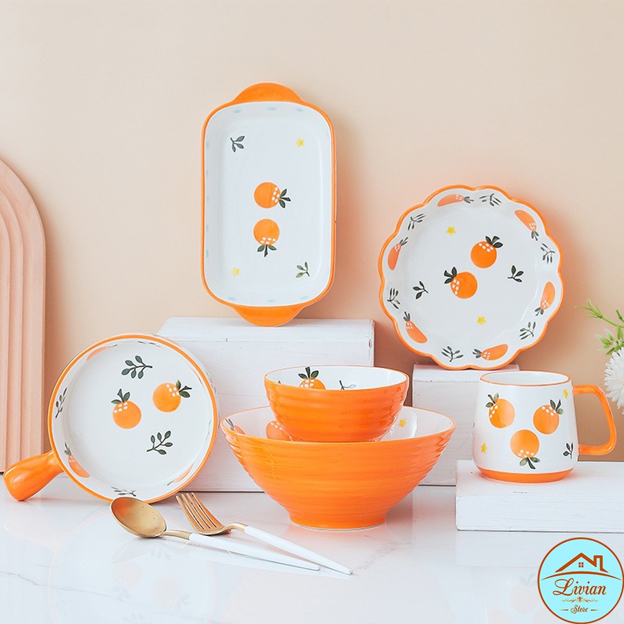 + Bộ sưu tập bát đĩa sứ họa tiết cam gồm 6 món.