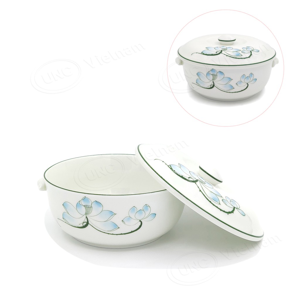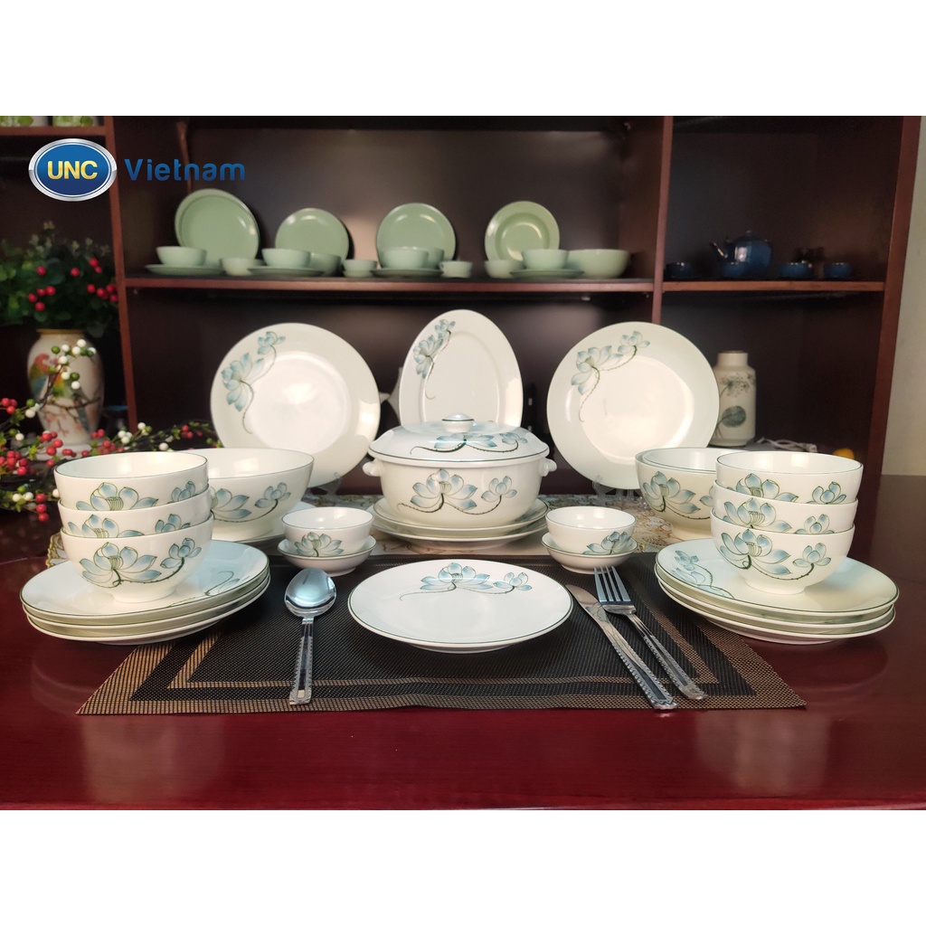 Giới thiệu Bát Đĩa Sứ UNC Việt Nam - Bông Sen Xanh vẽ tay 100%, men kem cao cấp, đủ món, không chứa Chì & Cadimi.