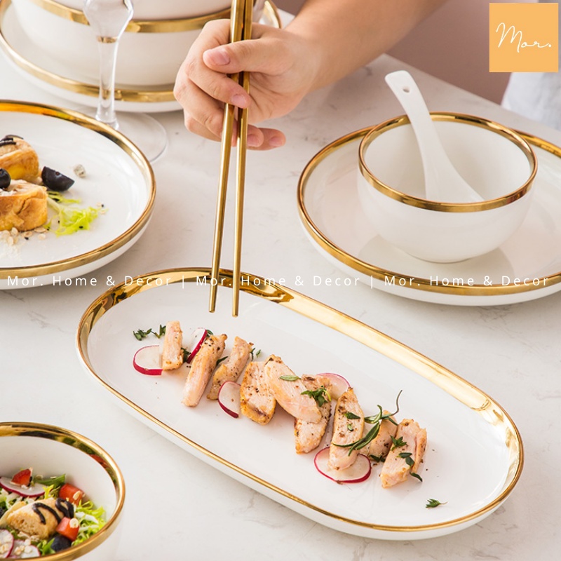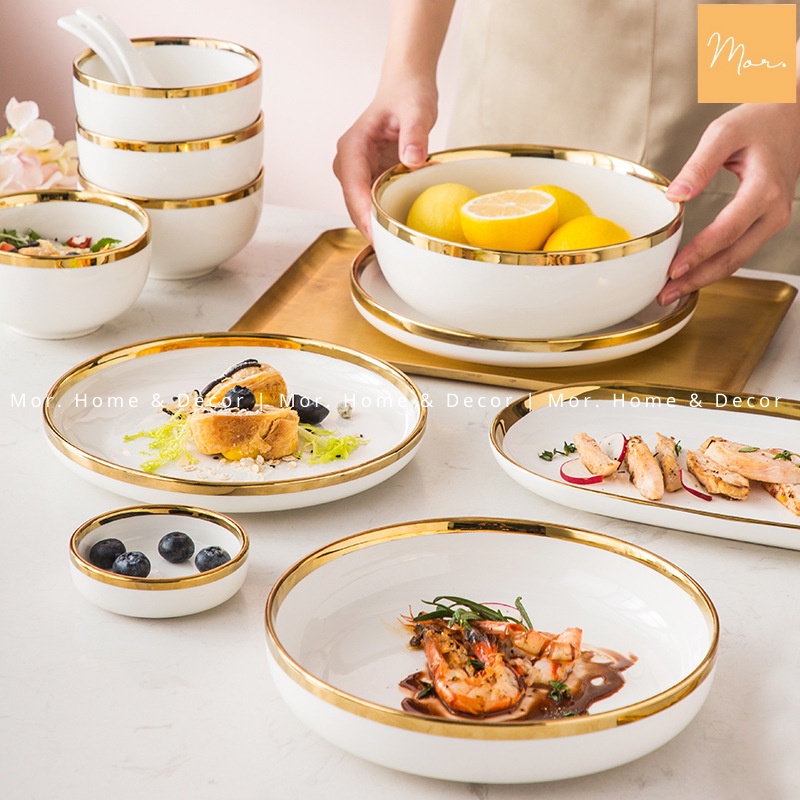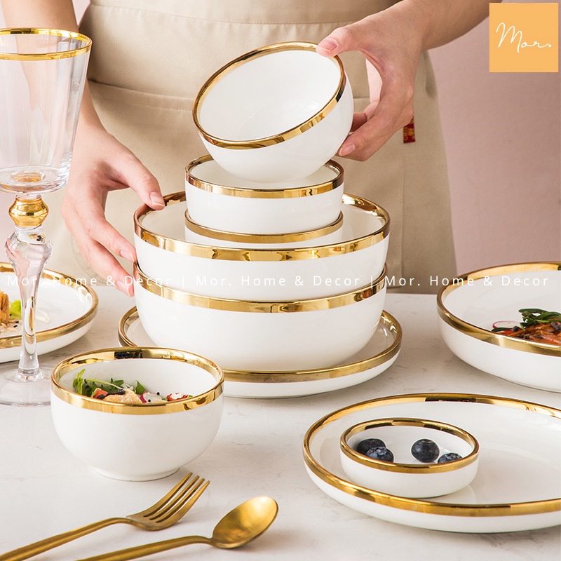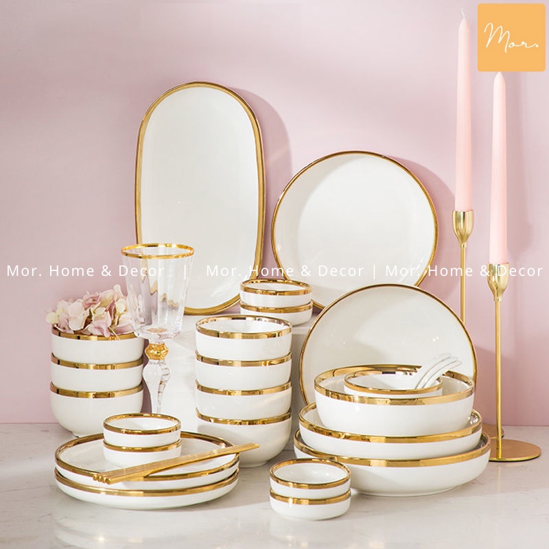 Chào mừng các tín đồ yêu bếp đến với bộ bát đĩa sứ siêu sang nhà 𝗠𝗼𝗿 nèee~Bộ bát đĩa được làm từ sứ cao cấp, tráng men bóng, bền đẹp, đặc biệt là điểm nhấn viền vàng siêu sang luôn 😍