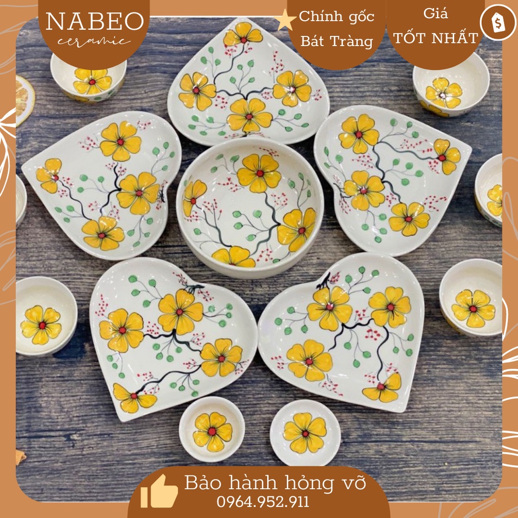 Bộ bát đĩa trái tim vẽ tay hoa nhiều màu chuẩn hàng Bát Tràng chính gốc cao cấpKích thước sản phẩm :