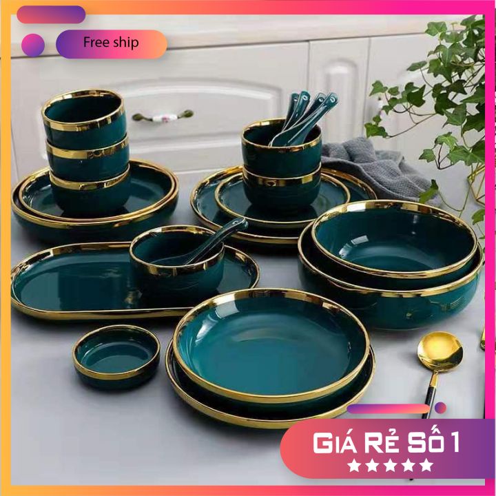 Bộ bát đĩa Gốm sứ cao cấp Xanh gấm viền vàng cao cấp sang trọng 32 sản phẩm dùng bữa ăn gia đình, tiệc, nhà hàng khách sạnĐặc trưng của sản phẩm bát đĩa cao cấp gốm sứỨng dụng :Tiệc, Gia đình, Nhà hàng – Khách sạn, Quán ăn