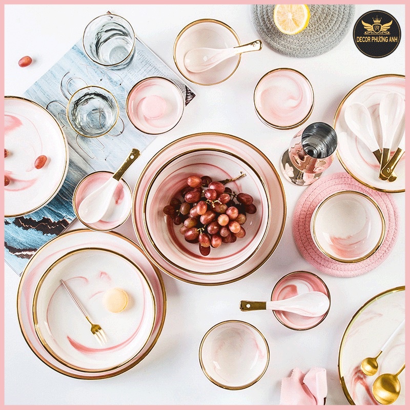 Sản phẩm gồm: 6 bát ăn cơm 6 bát chấm 6 thìa 6 đôi đũa vàng 1 bát tô to 2 đĩa sâu nhỏ 2 đĩa nhỡ nông 2 đĩa to nông 1 đĩa to đại nông
