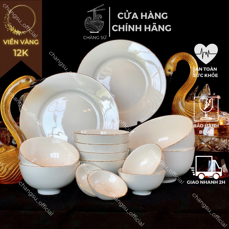 Bộ bát đĩa viền vàng thật 12k chất lượng cao - Set bát dĩa 14 món sứ Minh Châu siêu sang