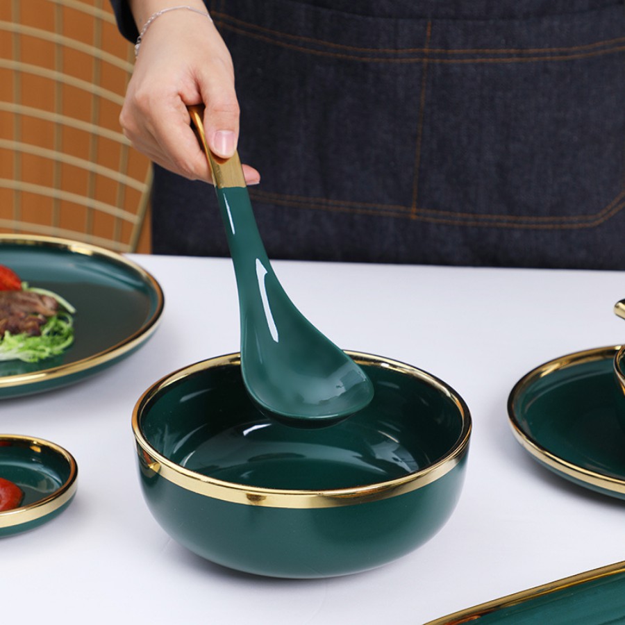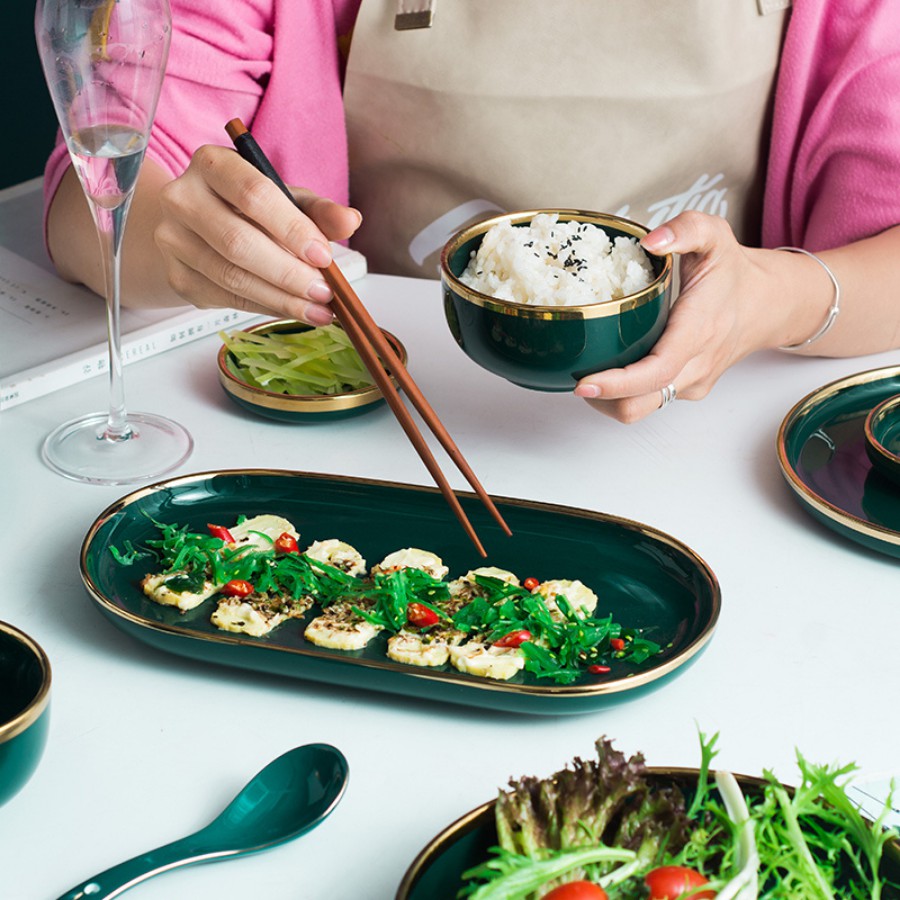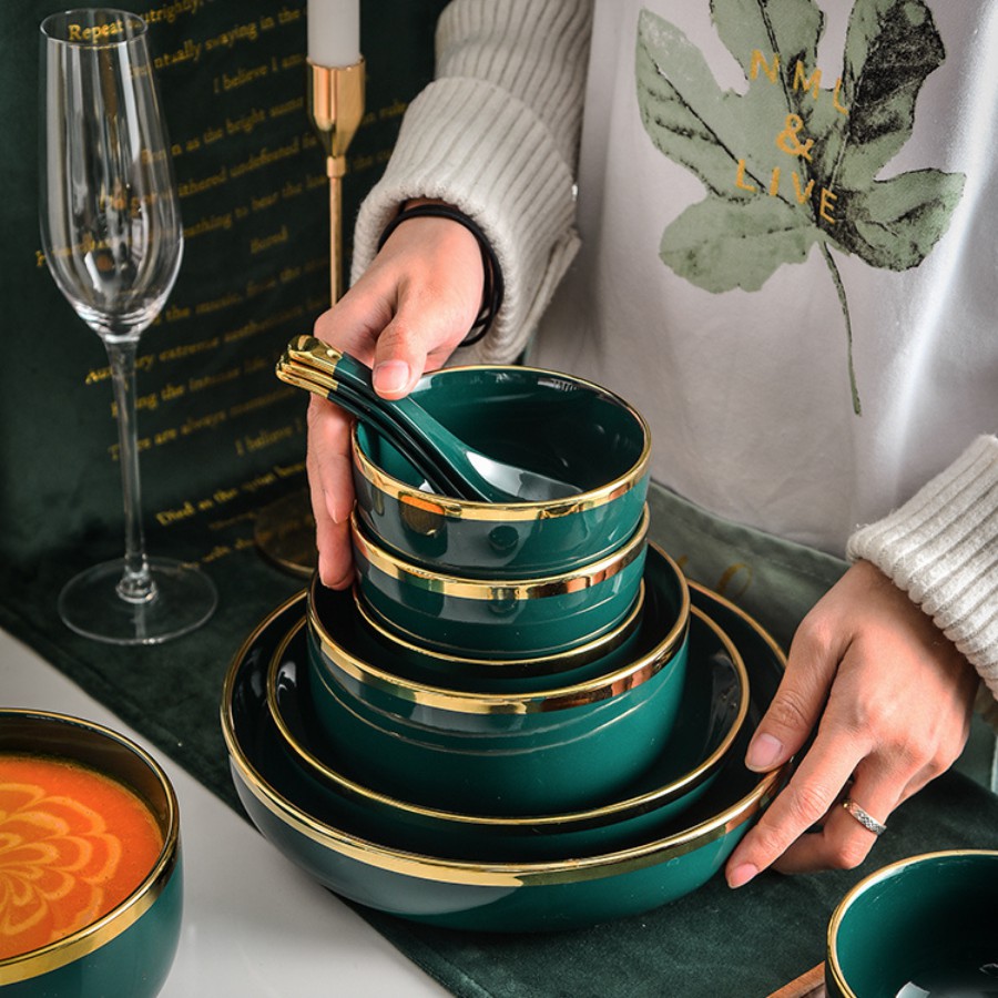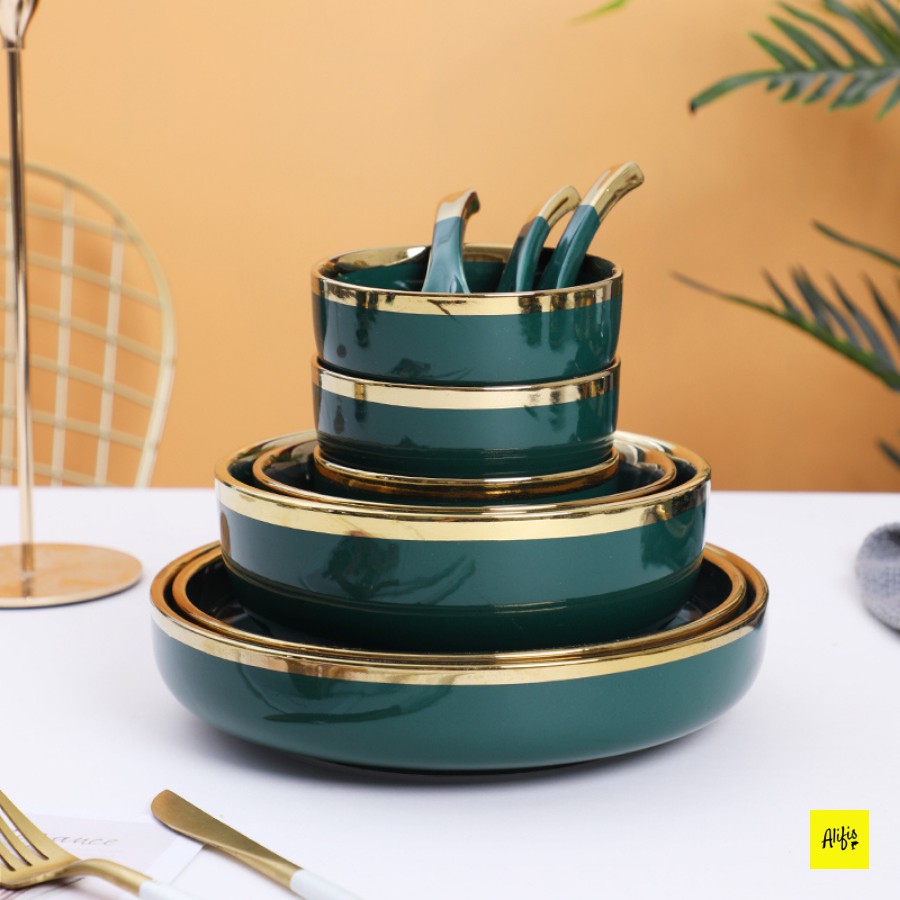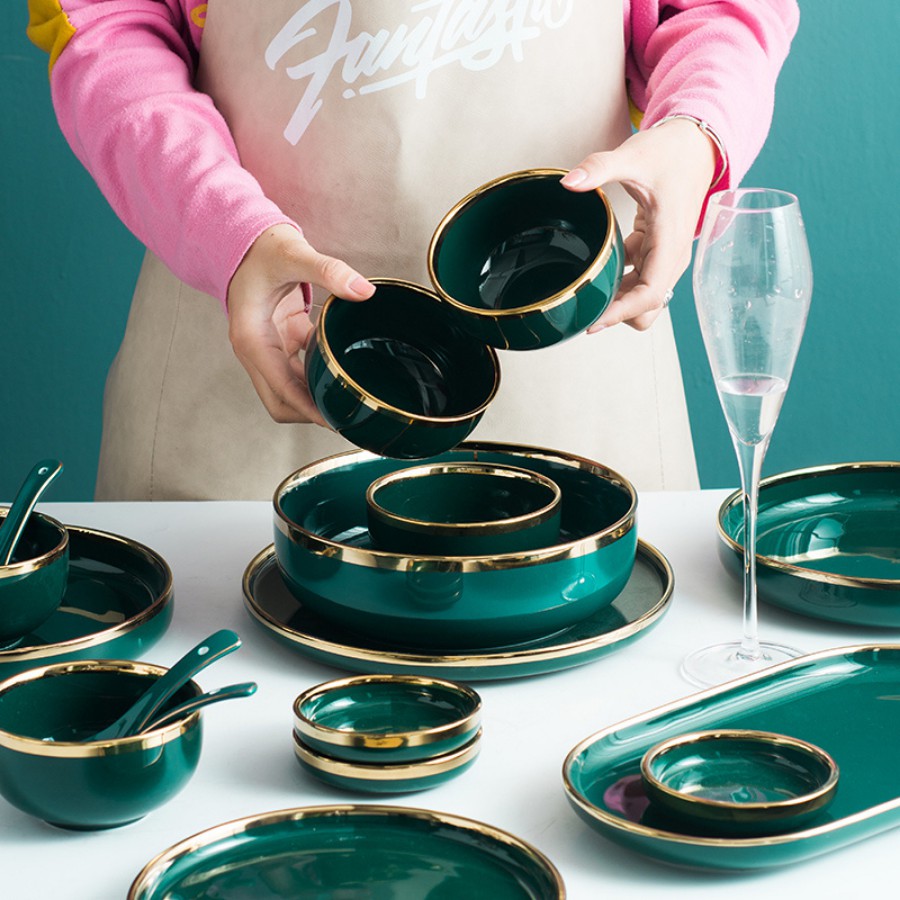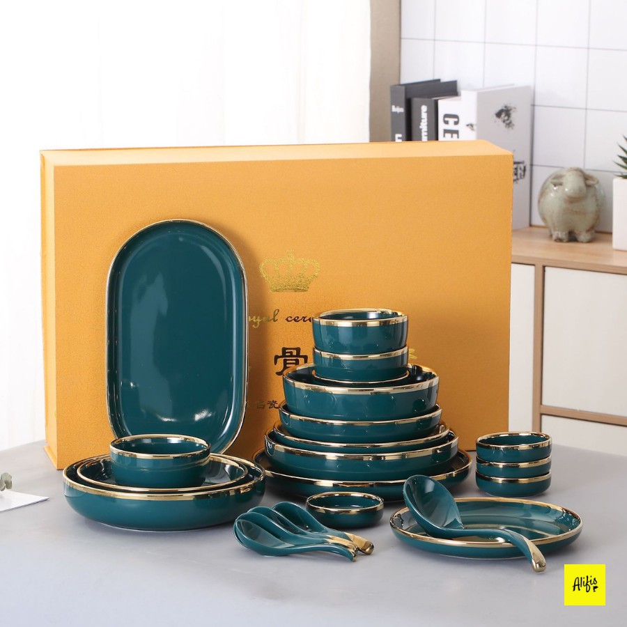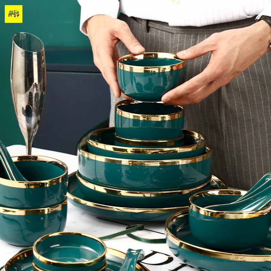 Nhà cửa & Đời sống > Bộ đồ bàn ăn > Dĩa || Bộ bát đĩa xanh cổ vịt viền vàng cao cấp – Phù hợp cho 2-6 người – Kèm hộp quà tặng sang trọngCòn hàng