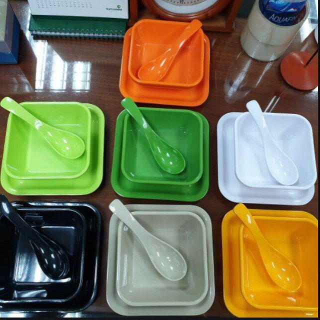 Bộ chén, dĩa vuông đựng chè và muỗng nhựa Melamine đủ màu(TV96+DV96+MCNo25)Bộ gồm 01 chén vuông, 01 dĩa lót vuông và 01 muỗng