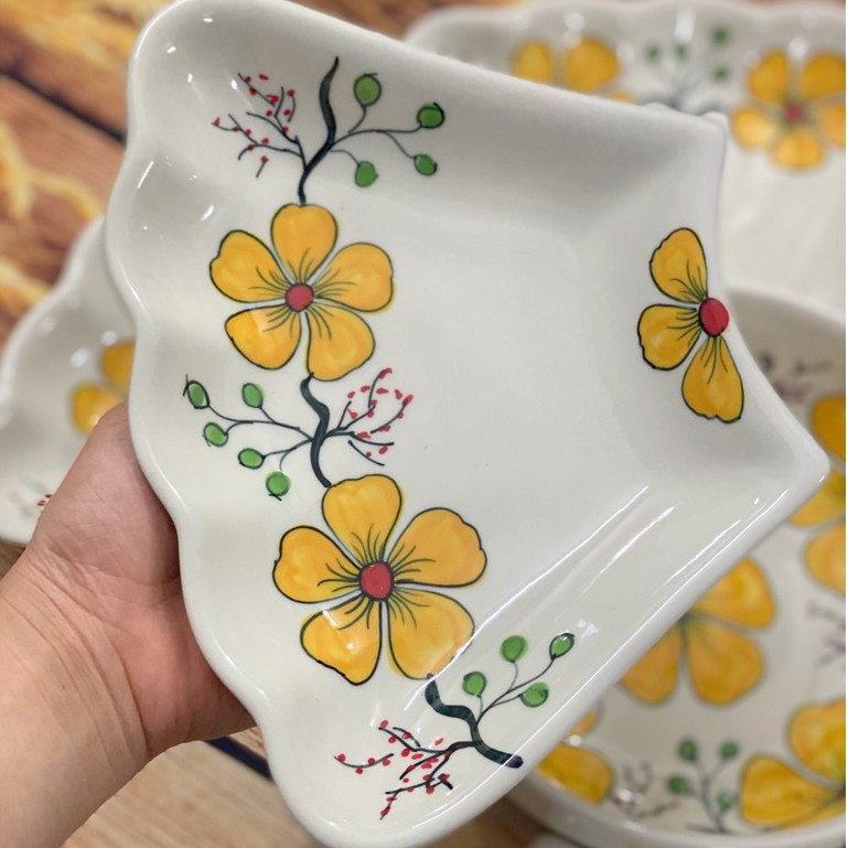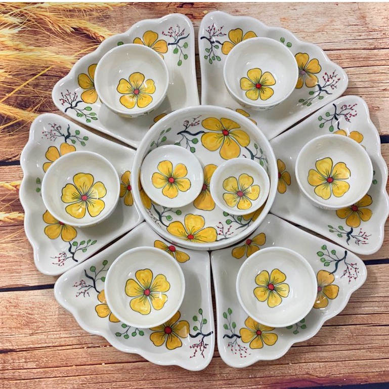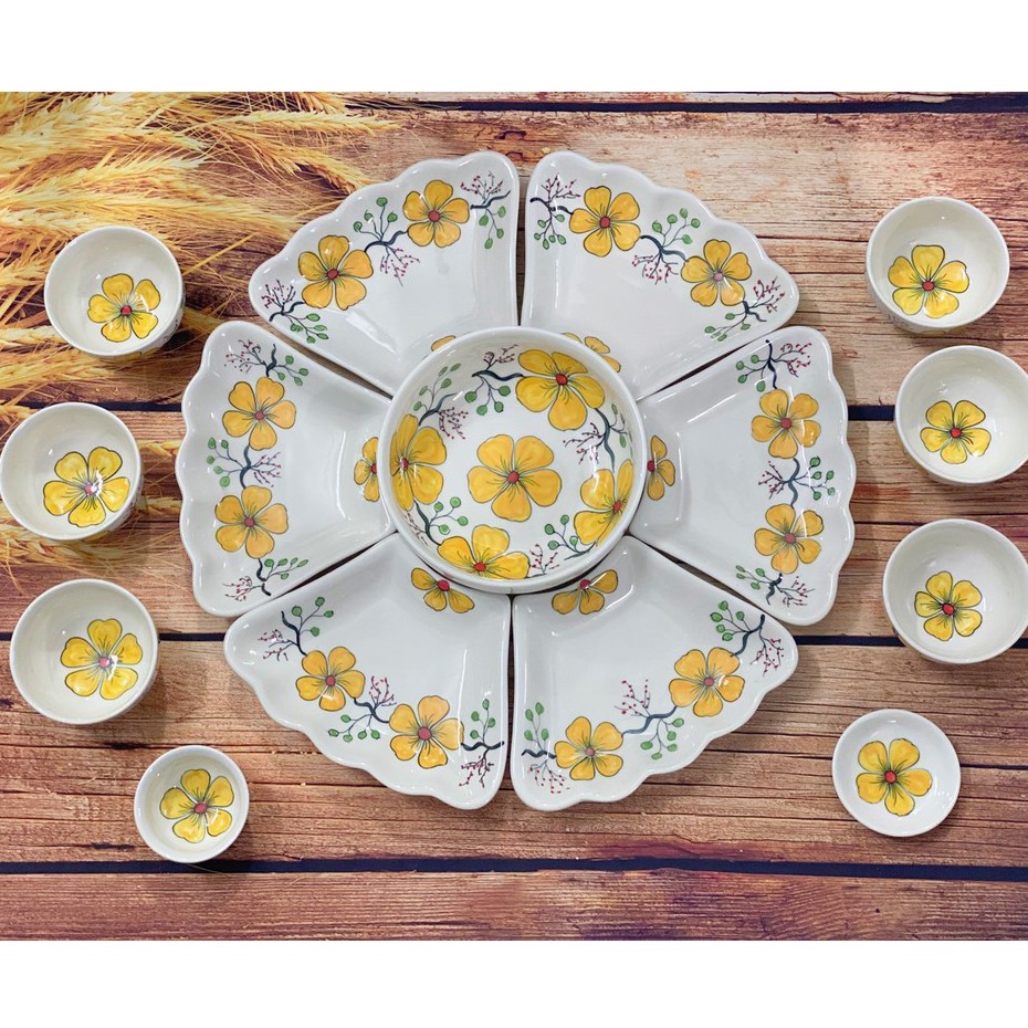 Bộ Bát Gia Tiên 6 Cánh Hoa Vàng Vẽ Tay - Bộ Bát Đĩa Cúng Gia Tiên - Gốm Sứ Bát Tràng
