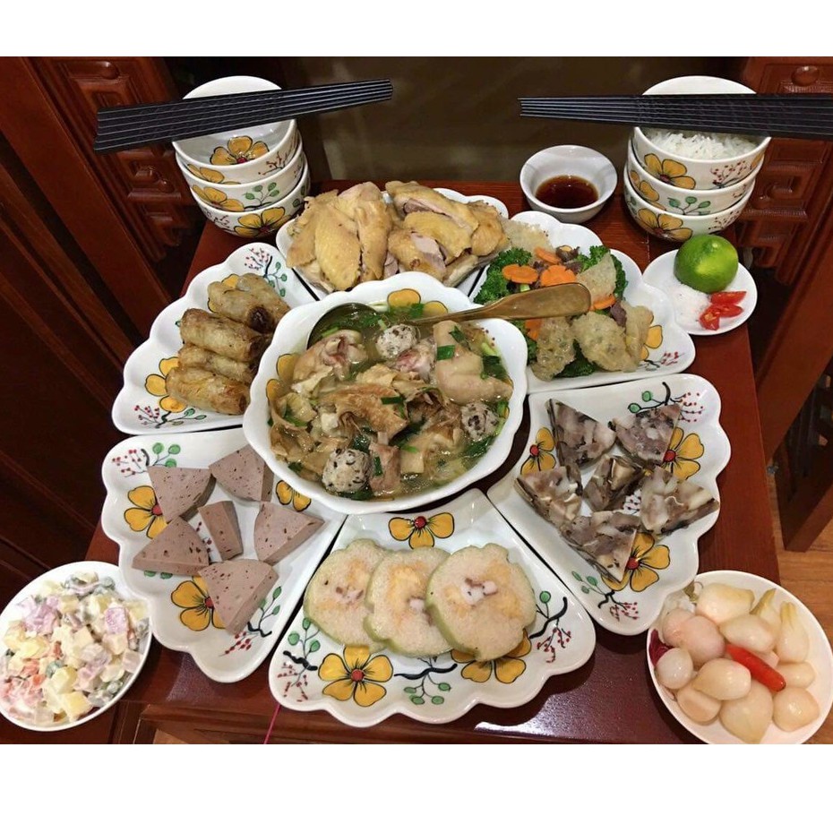 - Bộ đầy đủ: 1 tô lớn + 6 đĩa cánh hoa + 6 chén ăn cơm + 1 chén mắm + 1 chén muối