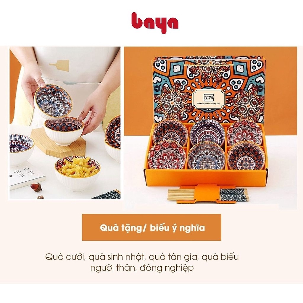 Bộ bát gốm kèm đũa BAYA SUN FLOWER tặng hộp đựng quà sang trọng, họa tiết thổ cẩm cao cấp 7300174, 7300172, 7300173