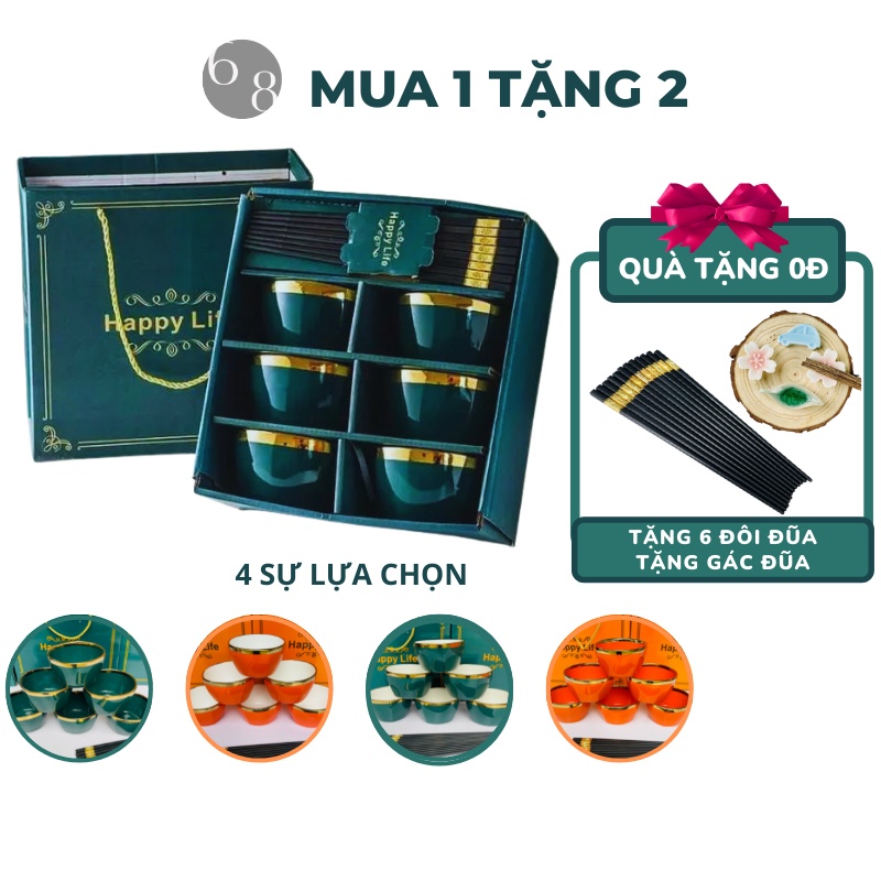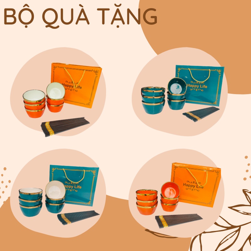 Bộ Bát HAPPY LIFE Bát ăn cơm Chén ăn cơm sứ Bộ bát quà tặng gốm sứ viền vàng cao cấp hộp đẹp tặng kèm 6 đôi đũa