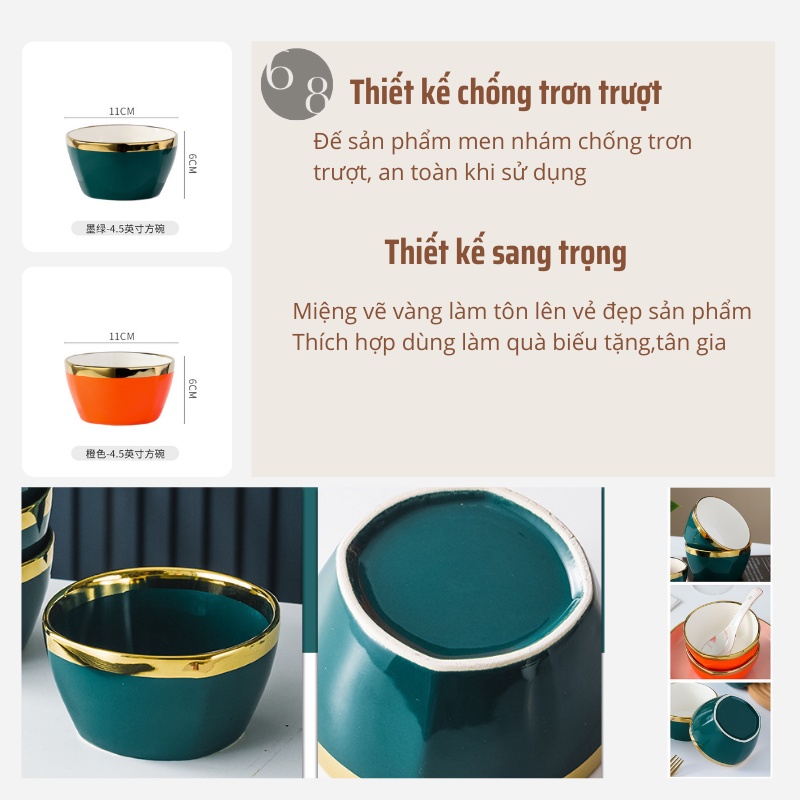- Chén ăn cơm sứ được thiết kế với 4 màu sắc hiện đại : Xanh Bắc Âu, Xanh Bắc Âu lòng trắng, Cam, Cam lòng trắng
