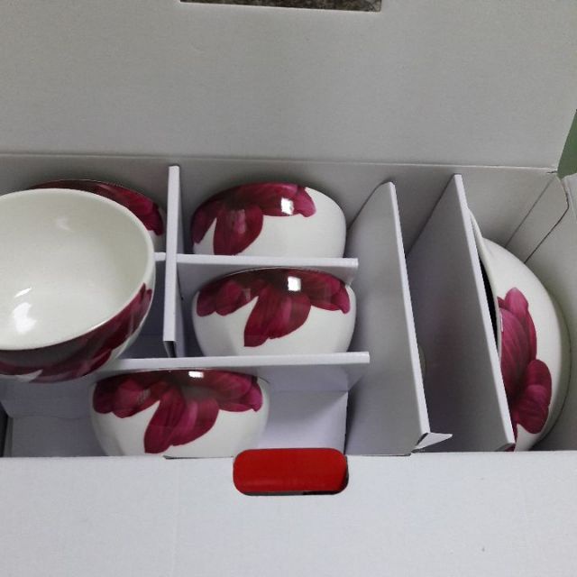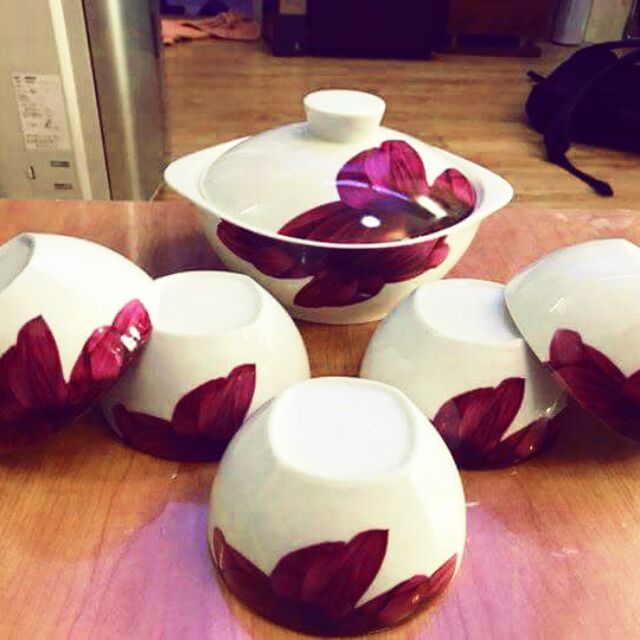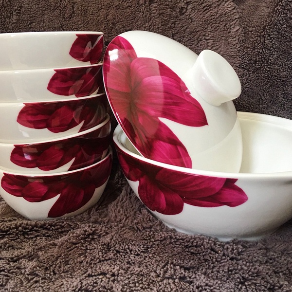 Bộ bát hoa hình thược dược cao cấp dùng trong nhà bếp hoặc biếu tặng cực sang trọngBộ ý hình gồm 5 bát con ăn cơm và 1 Âu cơm (canh) có nắp đậy