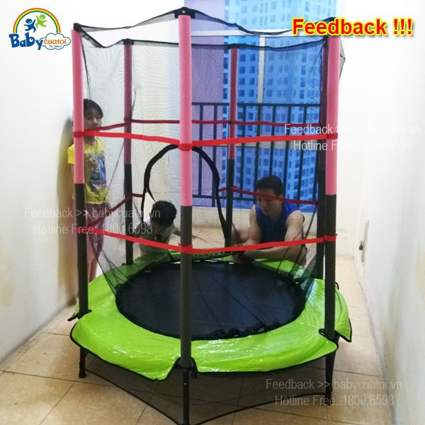 Bạt nhún lò xo tiêu chuẩn quốc tế, có lưới bảo vệ tại vành trong của trampoline (loại lưới bảo vệ tại vành ngoài là sản phẩm không đảm bảo độ an toàn cho bé)