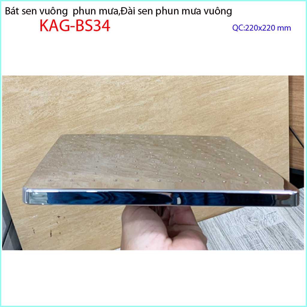 Bát sen tắm đứng vuông 20x20 cm, đầu sen phun mưa, bát sen tắm phun mưa KAG-BS34Chất liệu: Mặt phun mưa mạ lớp Crome sáng bóng, mặt ốp lưng inox bóng