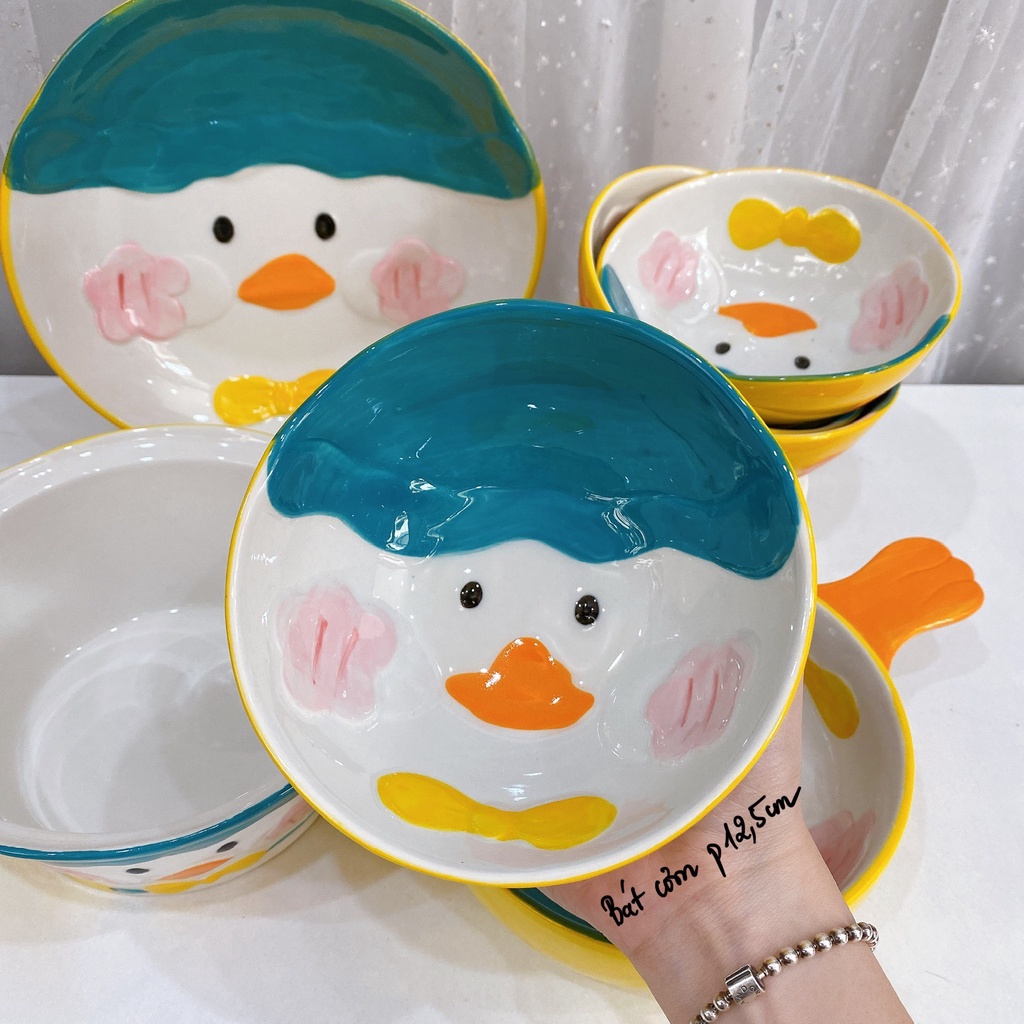 Bát Sứ Bát Ăn Cơm Bộ Bát Đĩa Decor Bộ Chén Dĩa Sứ vẽ tay họa tiết nổi hình vịt vàng 7 món cực đẹp