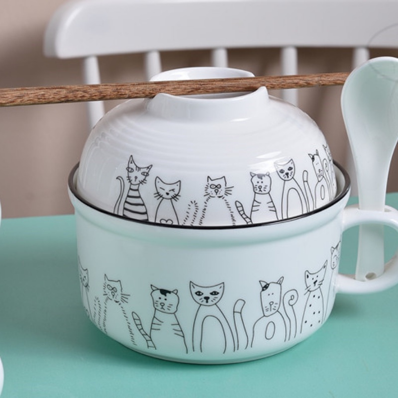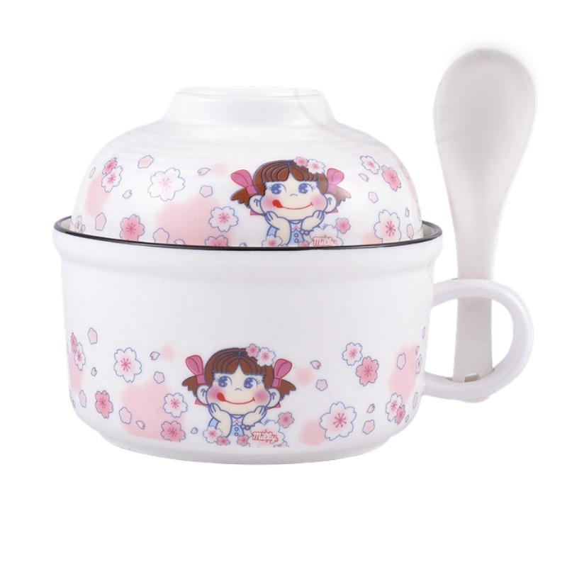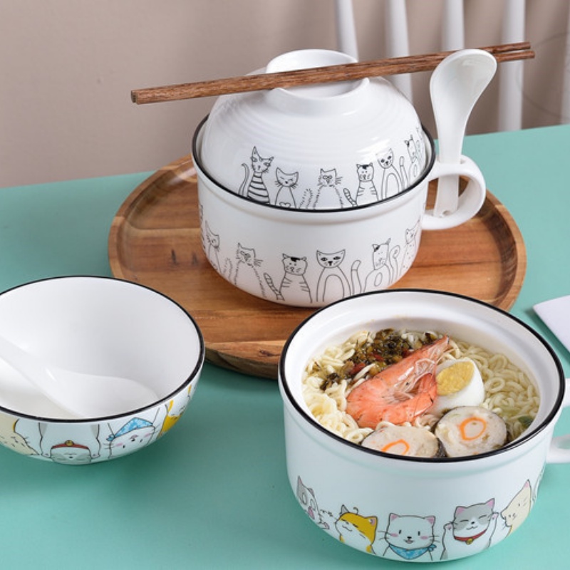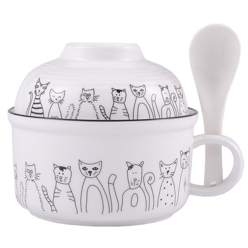 Bát sứ - Bát tô ăn mì kèm nắp lớn - có 1 bên tai cầm gài thìa sứ trắng tiện lợi - Tô ăn dặm cho bé