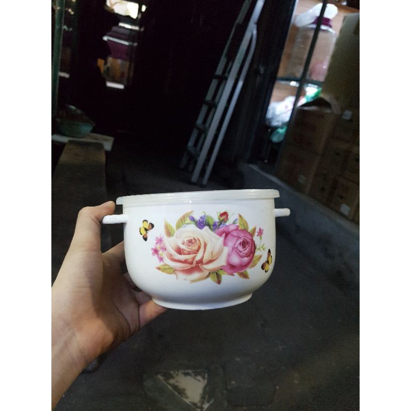hoa văn là bồn hoa hồng, nắp nhựa có 1 lớp cao su và nút mở cao su thoát hơi. phù hợp đựng cơm, cháo, đồ nóng.