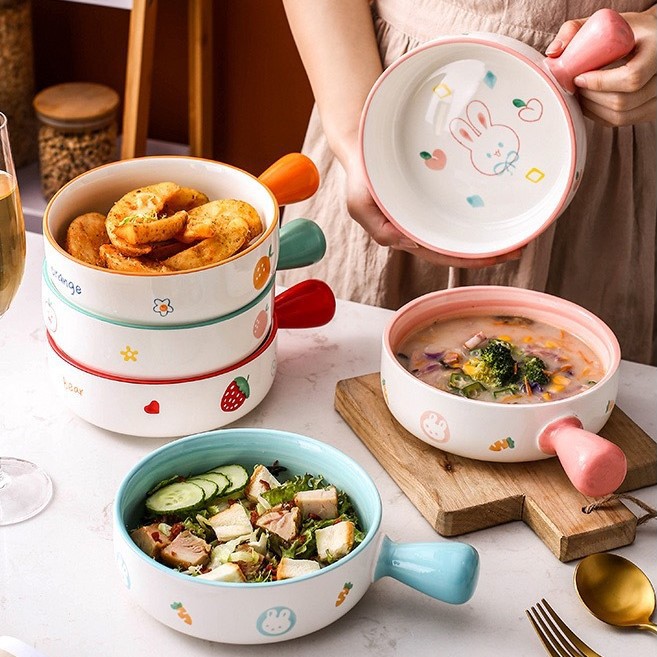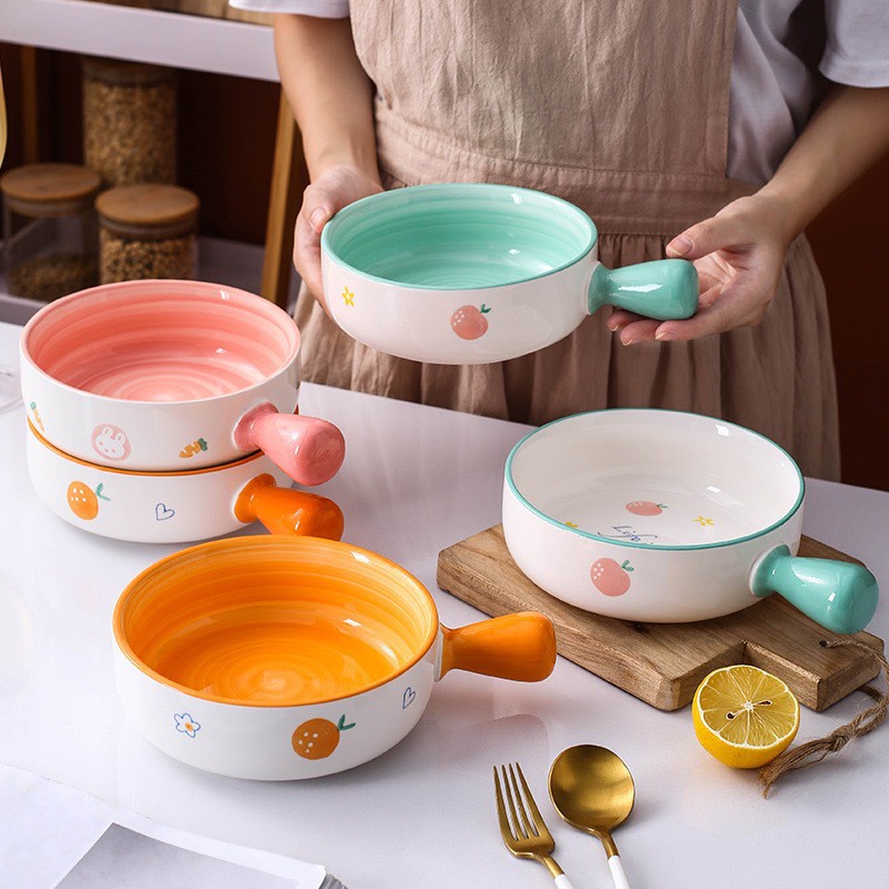 Bát sứ có tay cầm, thố nướng tròn họa tiết phong cách Hàn Quốc