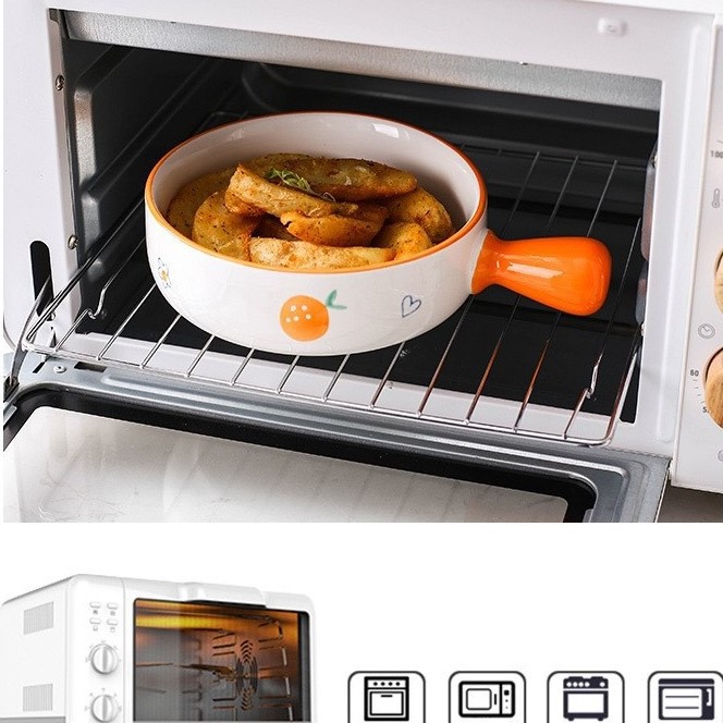 - Thố nướng tròn có tay cầm dùng để trang trí đồ ăn, nướng bánh cực kỳ tiện dụng và đẹp mặt. Tay cầm tiện lợi cho việc bưng bê, di chuyển.