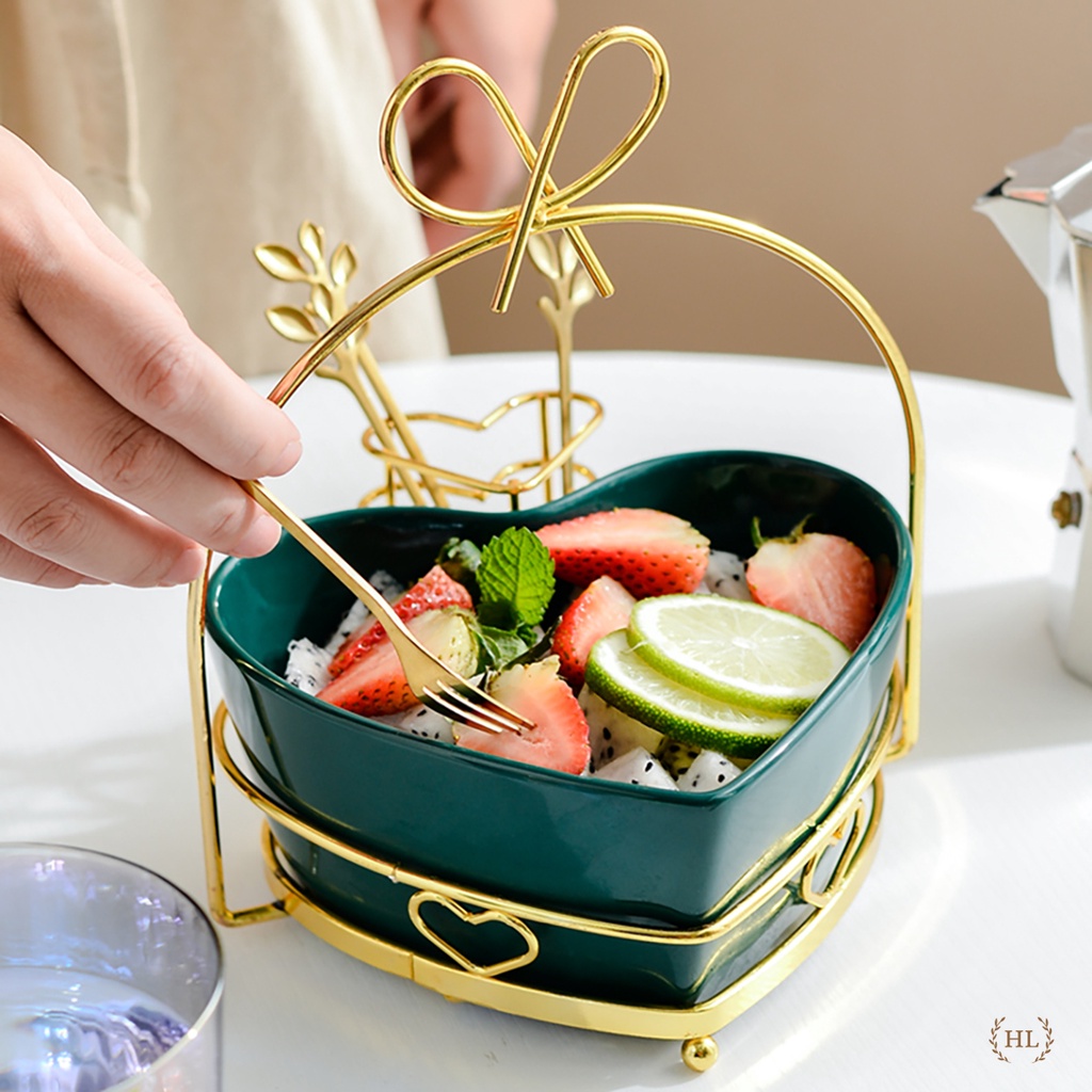 Bát Sứ Hình Trái Tim Kèm Khung - 4 Nĩa Inox Vàng Kim Không Ăn Mòn Cao Cấp Home Luxury Creamic 2022