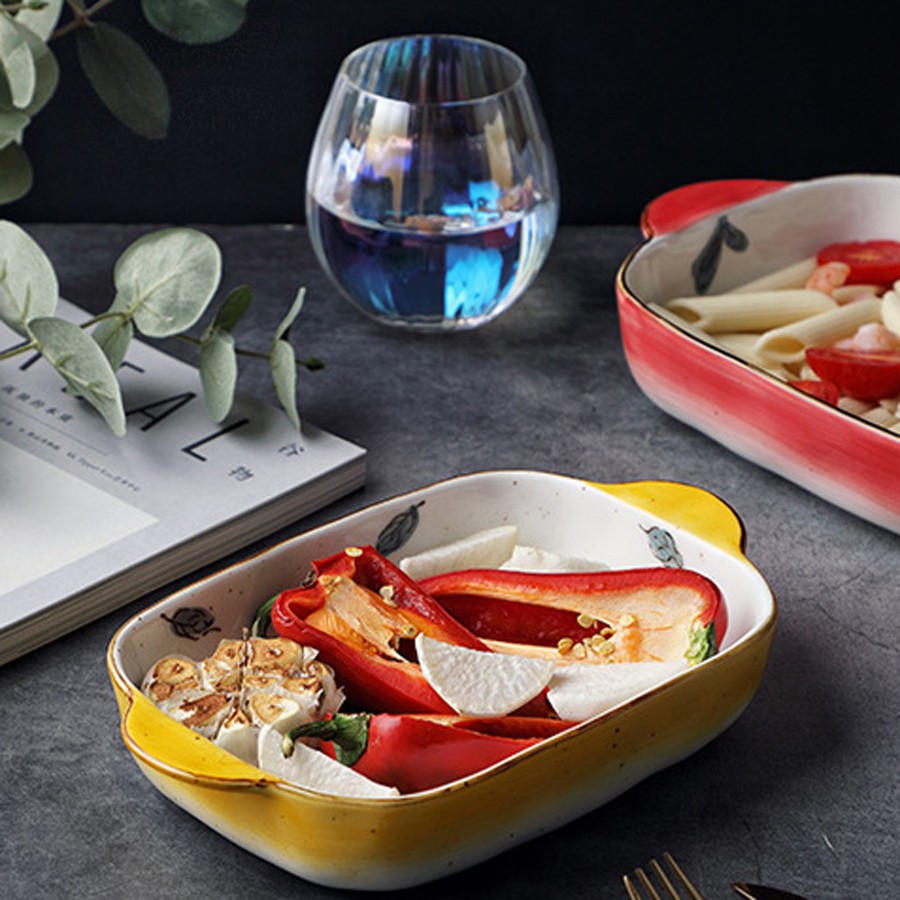 Bát sứ, thố nướng chữ nhật có quai cầm họa tiết hoa quả cực xinh- 2 dung tích