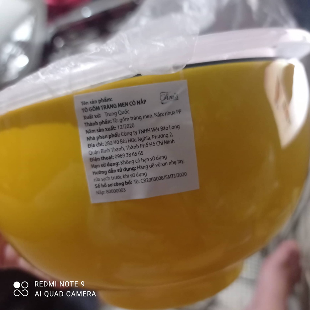 Nhà cửa & Đời sống > Bộ đồ bàn ăn > Tô || Bát tô gốm sứ tráng men vàng có nắp nhựa hút chân khôngCòn hàng