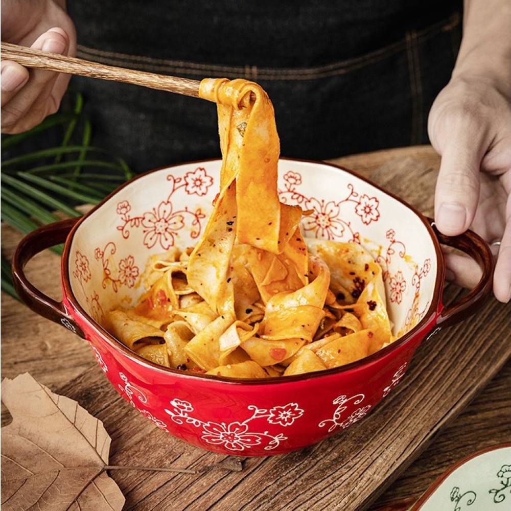 Bát tô sứ 2 tai họa tiết hoa đào phong cách Nhật Bản đường kính 15.5cm dung tích 620ml