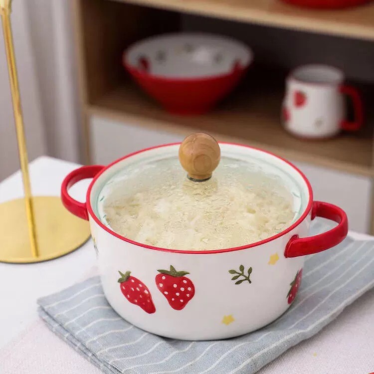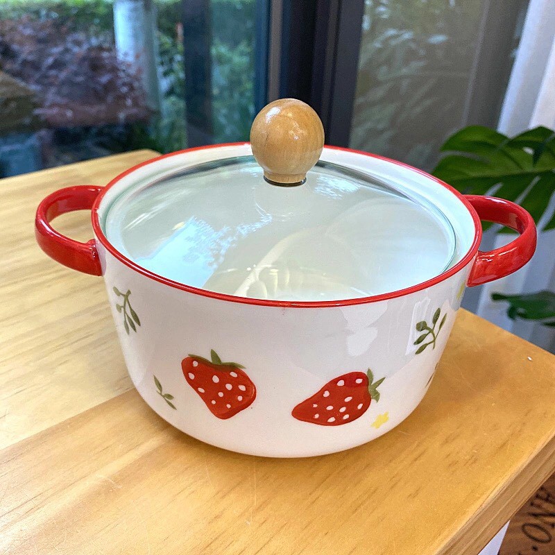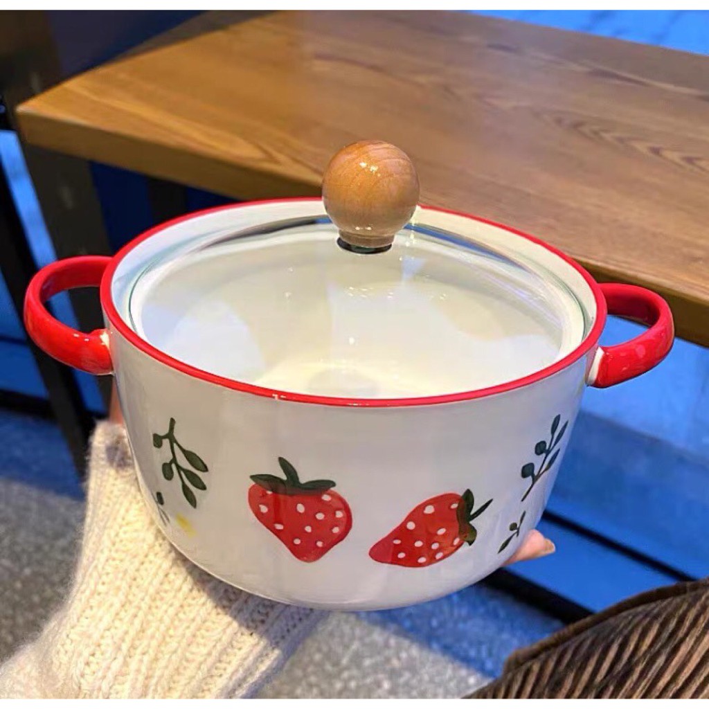 Nhà cửa & Đời sống > Bộ đồ bàn ăn > Tô || Bát tô sứ có nắp kính họa tiết dâu tây dung tích 900mlCòn hàng
