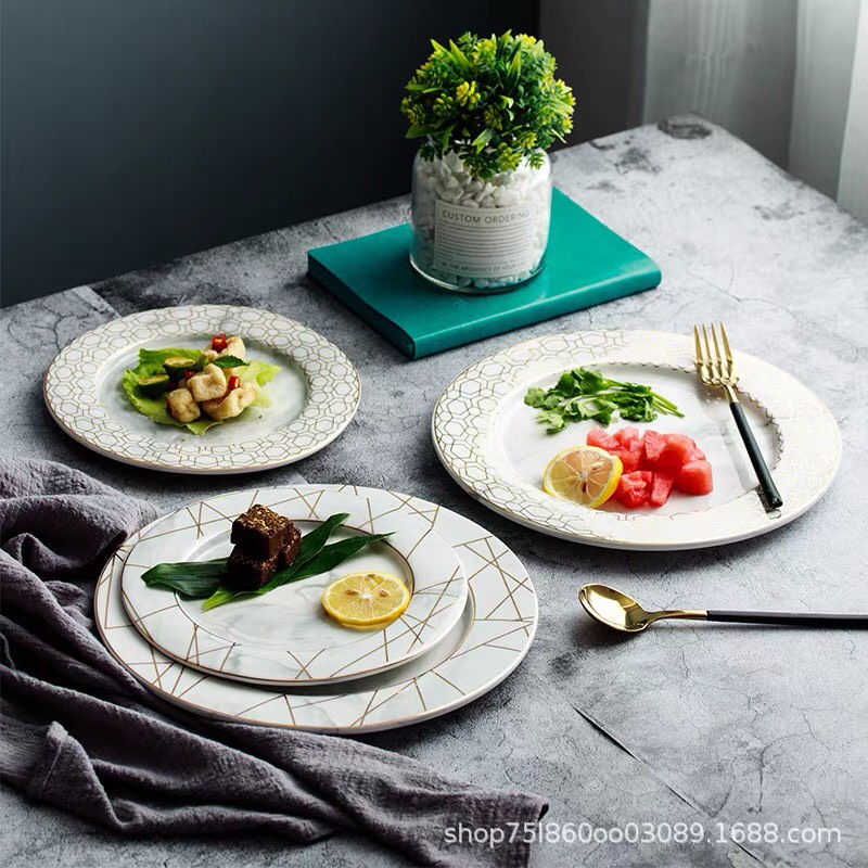 Nhà cửa & Đời sống > Bộ đồ bàn ăn > Dĩa || Bộ bát và đĩa phong cách Bắc Âu sang trọng, viền vàng,ăn tiệc cao cấp, để salad, ăn chính,Còn hàng