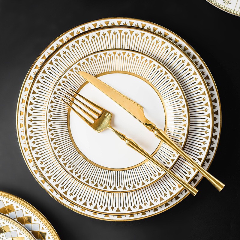 Bộ bát và đĩa phong cách Bắc Âu sang trọng, viền vàng, bát đĩa ăn tiệc cao cấp, đĩa salad, đĩa chính, bát soup