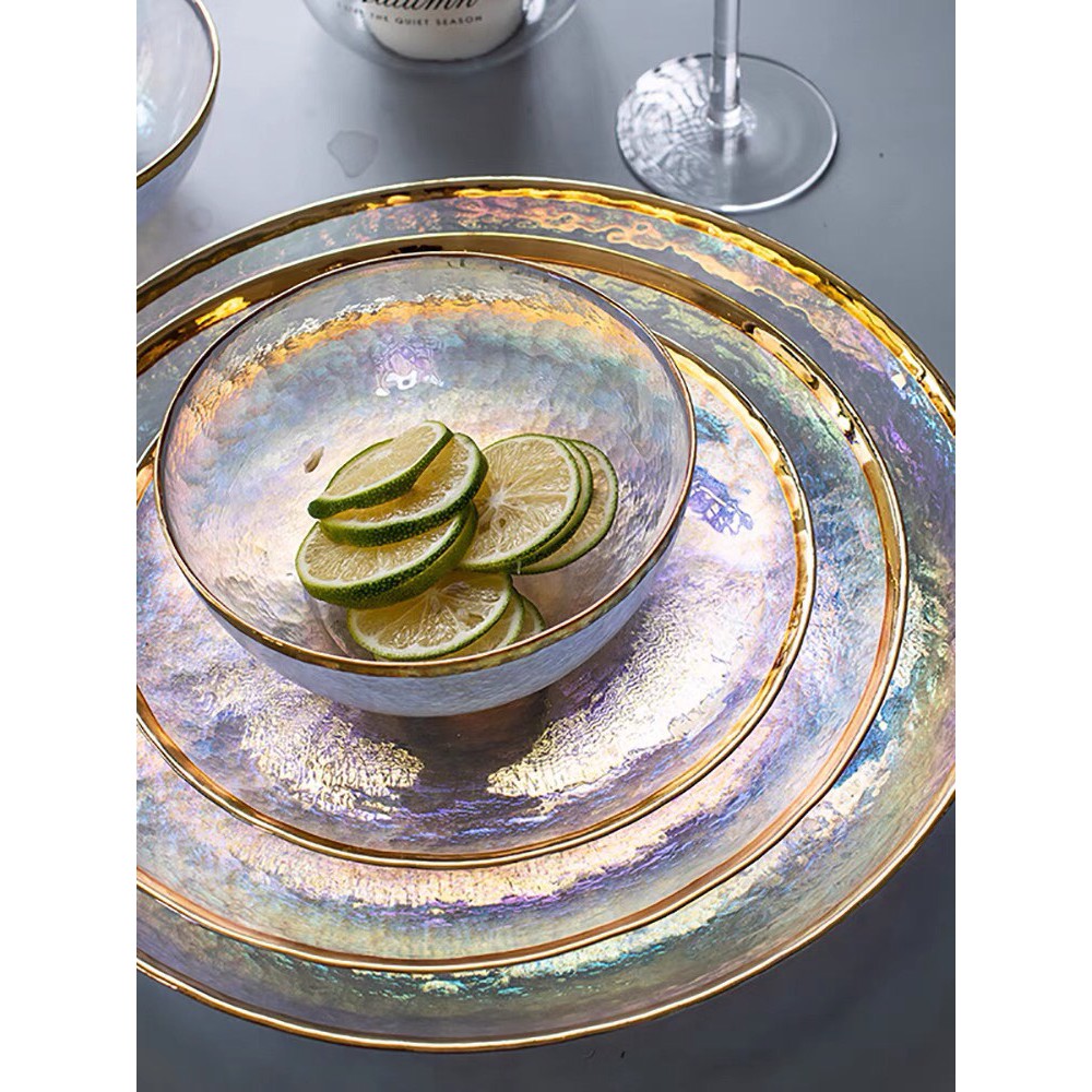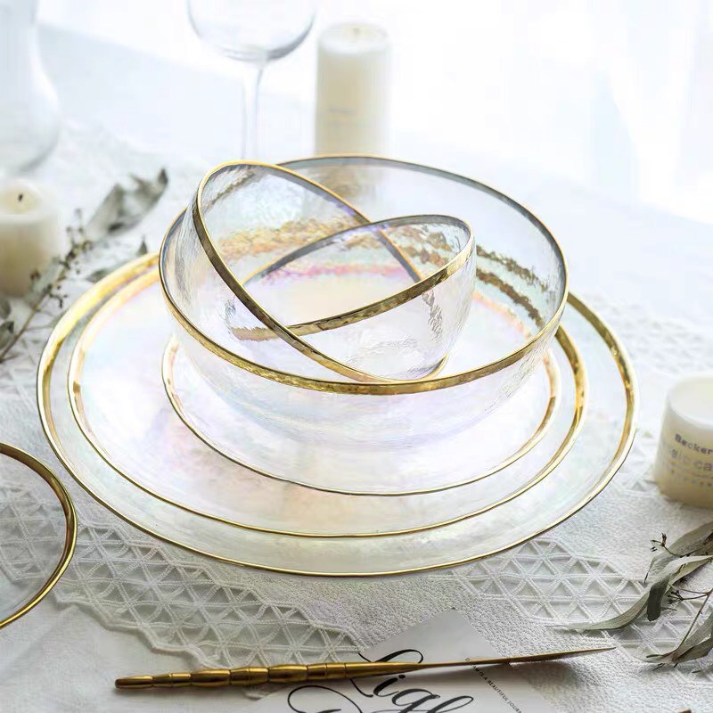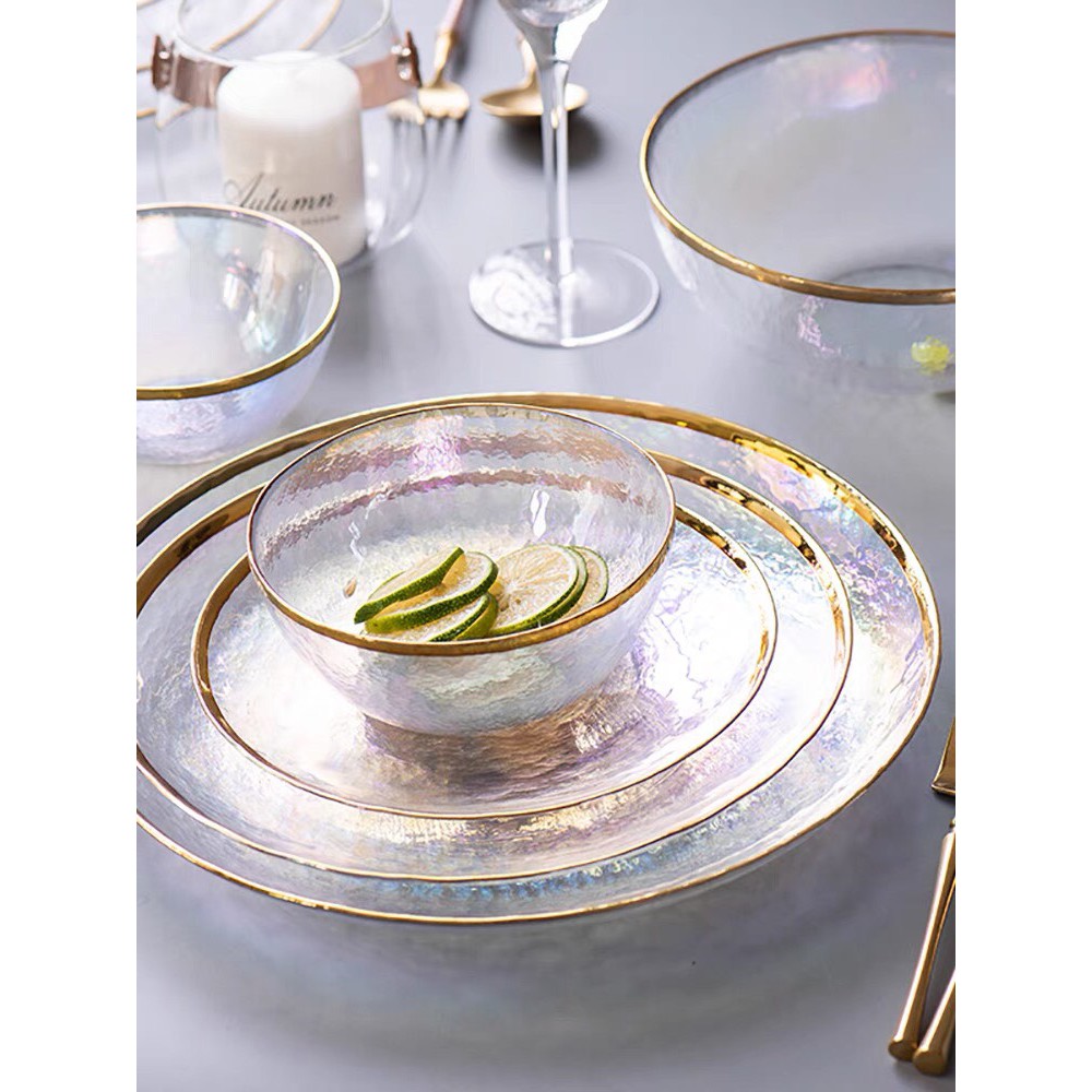 Bộ bát và đĩa phong cách Bắc Âu sang trọng, viền vàng,ăn tiệc cao cấp, để salad, ăn chính, set thủy tinh lạ