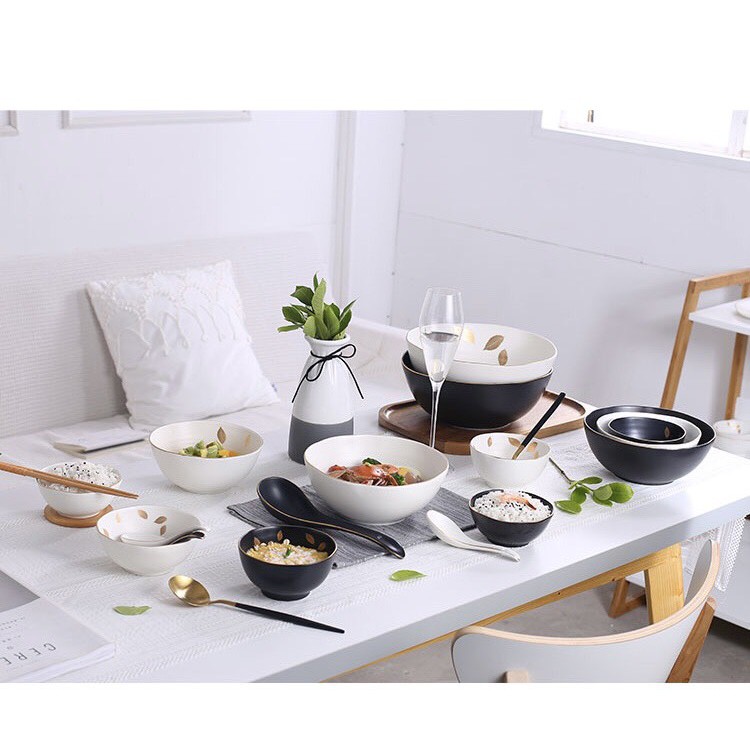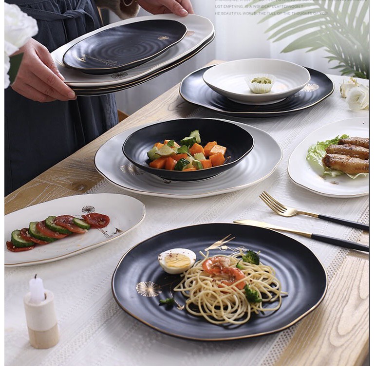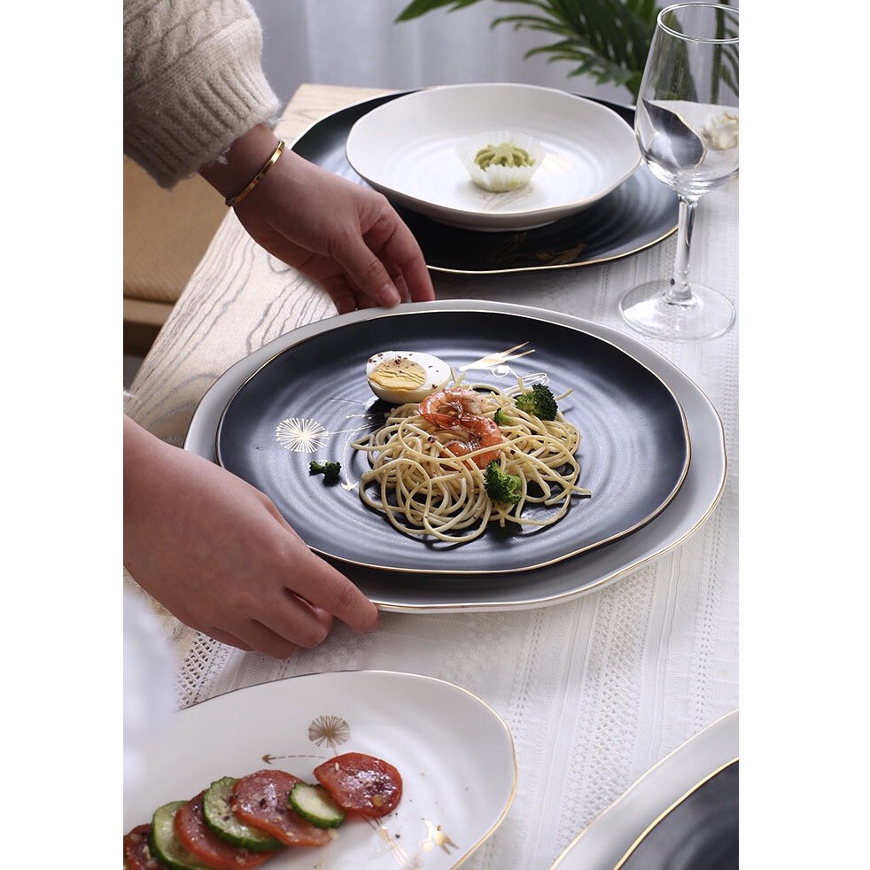Nhà cửa & Đời sống > Bộ đồ bàn ăn > Dĩa || Bộ bát và đĩa phong cách Bắc Âu sang trọng, viền vàng,ăn tiệc cao cấp, để salad, ăn chính,Còn hàng