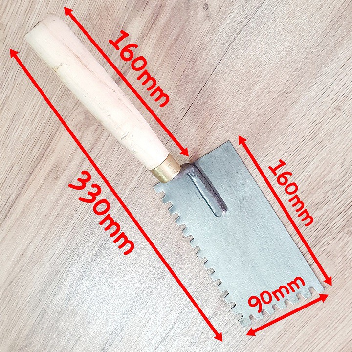 Đặc tính sản phẩm Bay Xây Vuông Lưỡi Thép 9x16,5cm Rãnh Răng Cưa Vuông 2 Cạnh 7x7x5mm Cán Gỗ