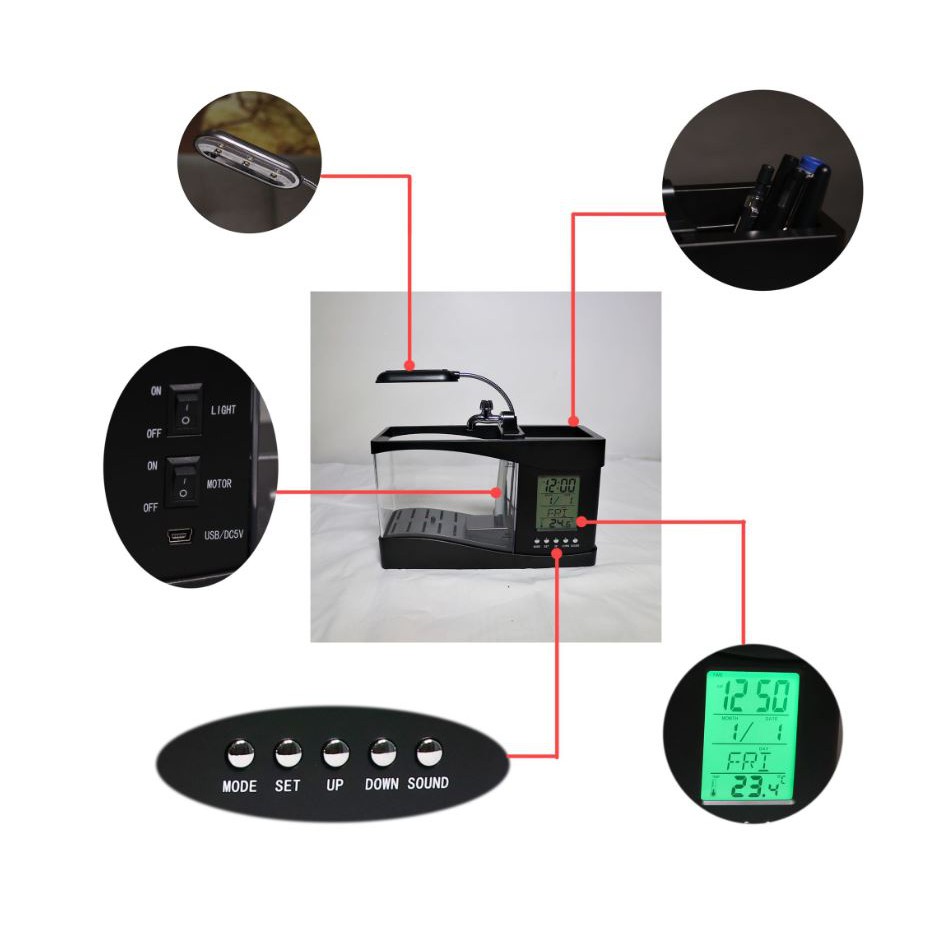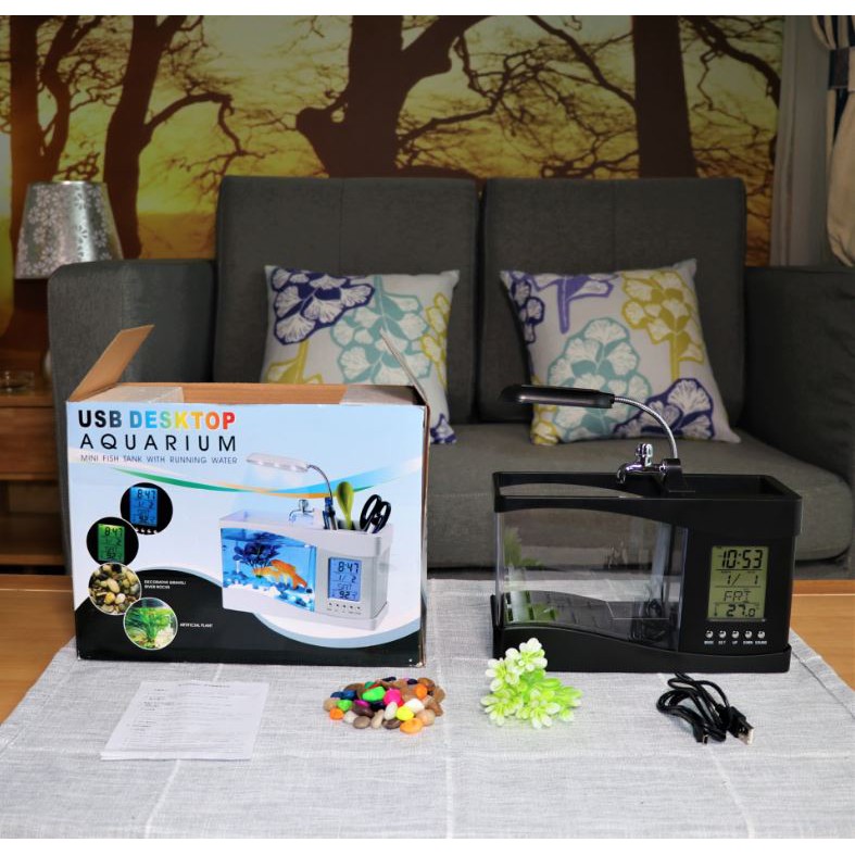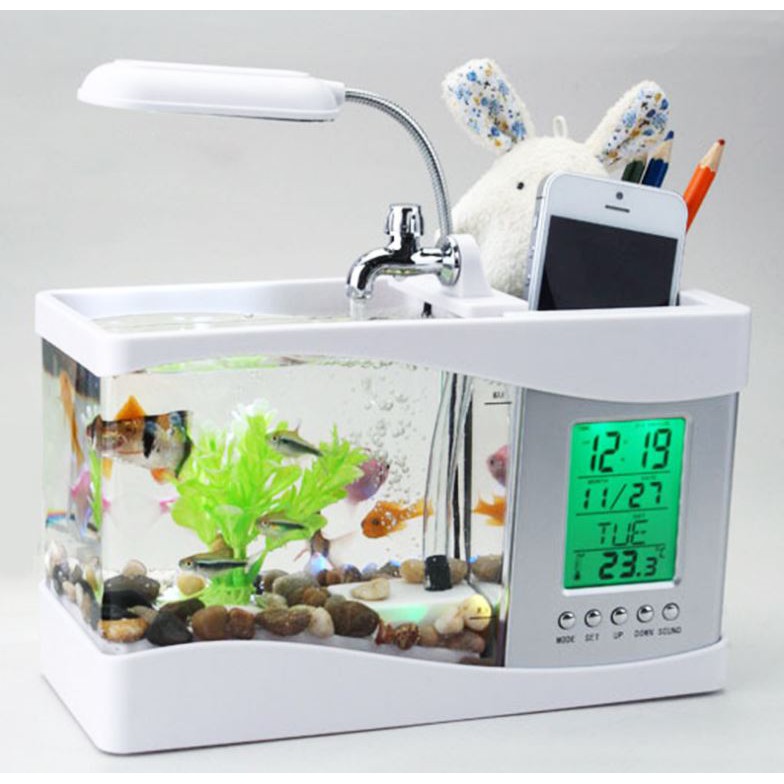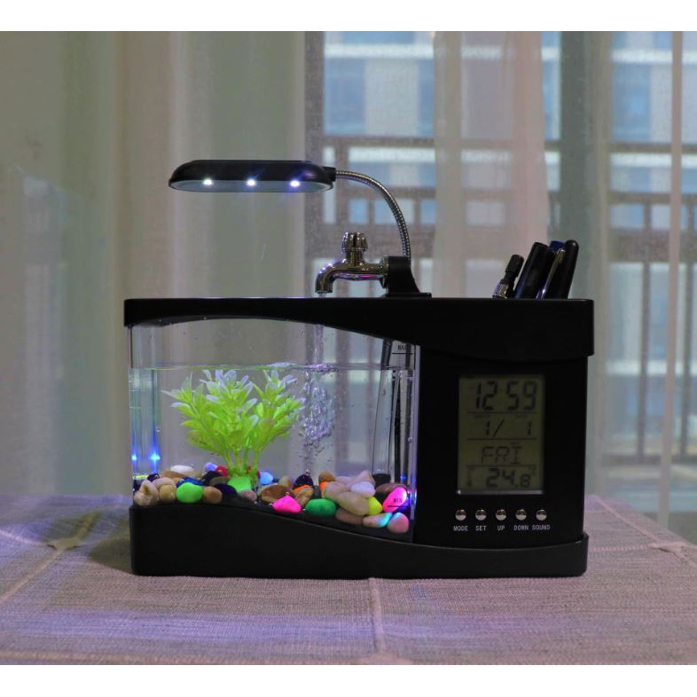 Giới thiệu sản phẩm Bể Cá Mini 3 in 1 Kiêm Đồng Hồ Để BànBạn đang tìm một món quà cực độc cho người đặc biệt? Hãy làm cho những bạn đồng nghiệp phát ghen lên với bể cá nhỏ dùng nguồn điện từ USB này. Hệ thống lưu thông nước, cung cấp đầy đủ oxi cho cá có thể sinh sống và phát triển mạnh mẽ. Hơn thế nữa, một chiếc đèn LED đổi màu đặt phía trên bể càng làm tăng sự bí ẩn của cuộc sống trong lòng nước lung linh.